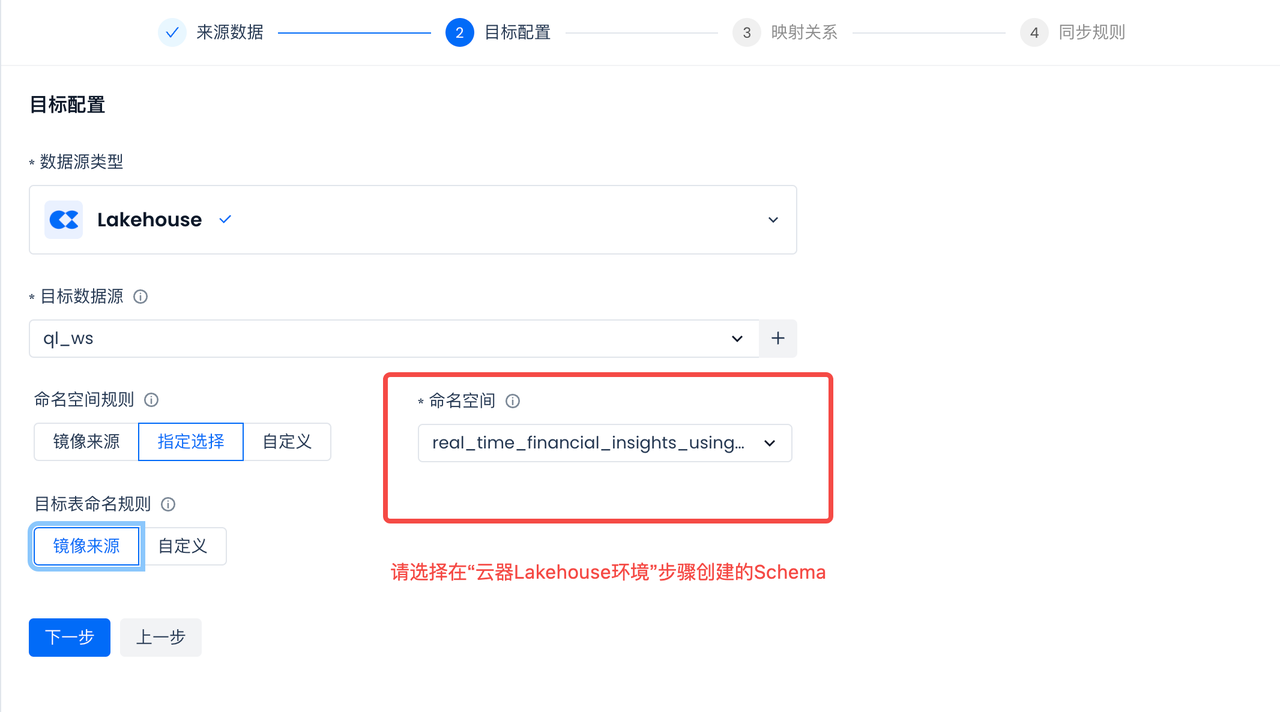 Select the existing Schema under the target data source as the storage location for the target table.
