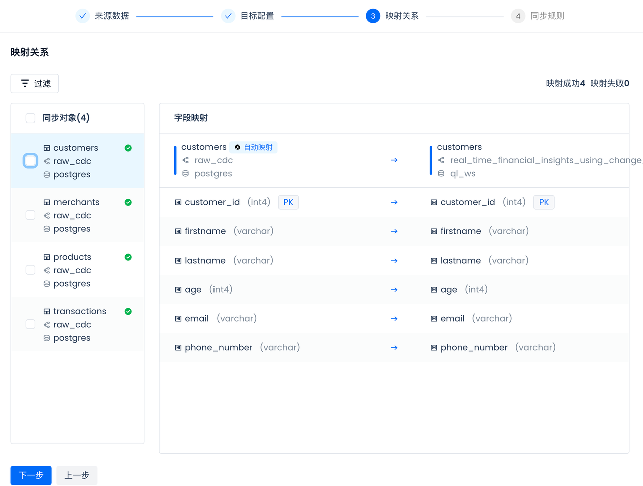Singdata Lakehouse will automatically form the mapping of tables and fields, including data type mapping. If there is no corresponding table in the selected Singdata Lakehouse namespace, the multi-table real-time sync task will automatically check and create the table when the task starts, without the need for manual pre-creation. CDC sync requires primary keys in the source tables, and the multi-table real-time sync will automatically create corresponding primary keys in the Lakehouse target tables.