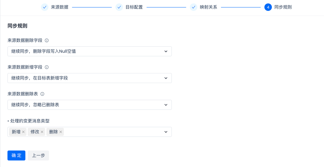 Additionally, the sync rules also support setting the types of source change messages that need to be processed. Please set as needed. For example, in some scenarios, it is expected that the data on the target side will always accumulate, without processing the "delete" changes from the source side. In this configuration, simply remove the "delete" option.