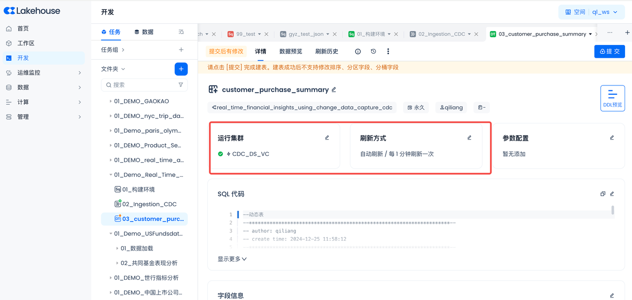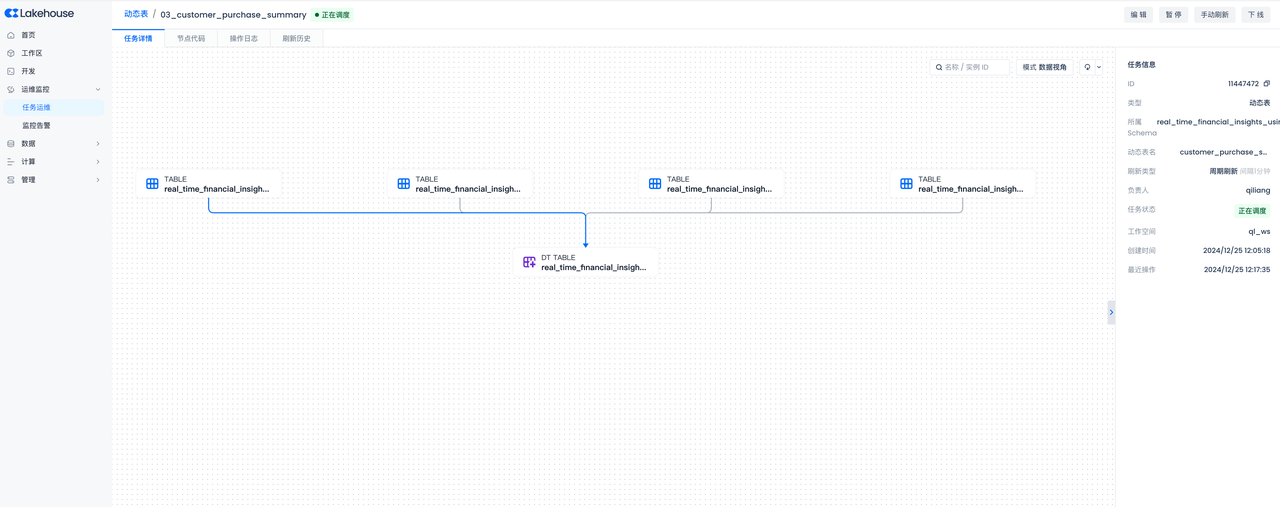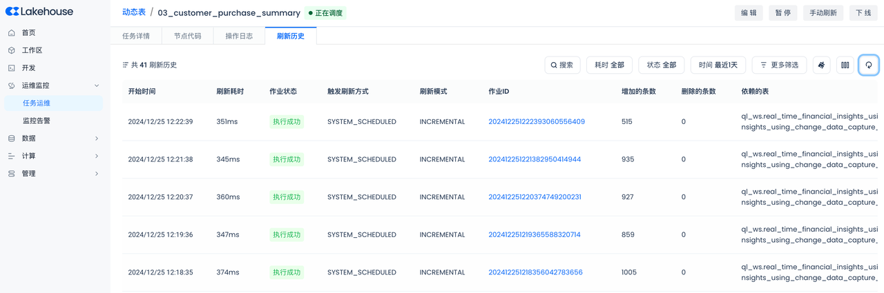 After successful submission, you can go to the Operations Center to view the task details and refresh history of the current table, and support starting or stopping the current table.
