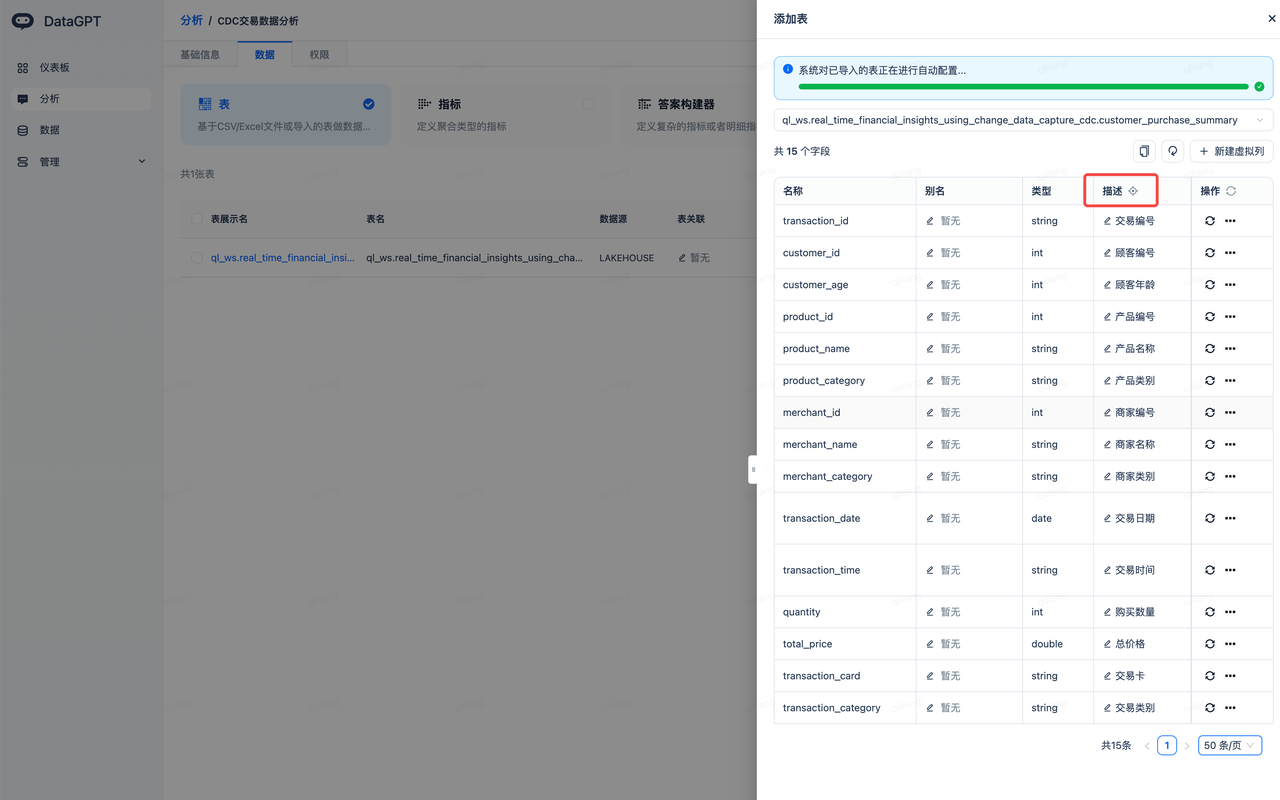 - Click the icon next to "Description," and the system will use a large model to add appropriate descriptions for each field, facilitating alignment with Chinese semantics.