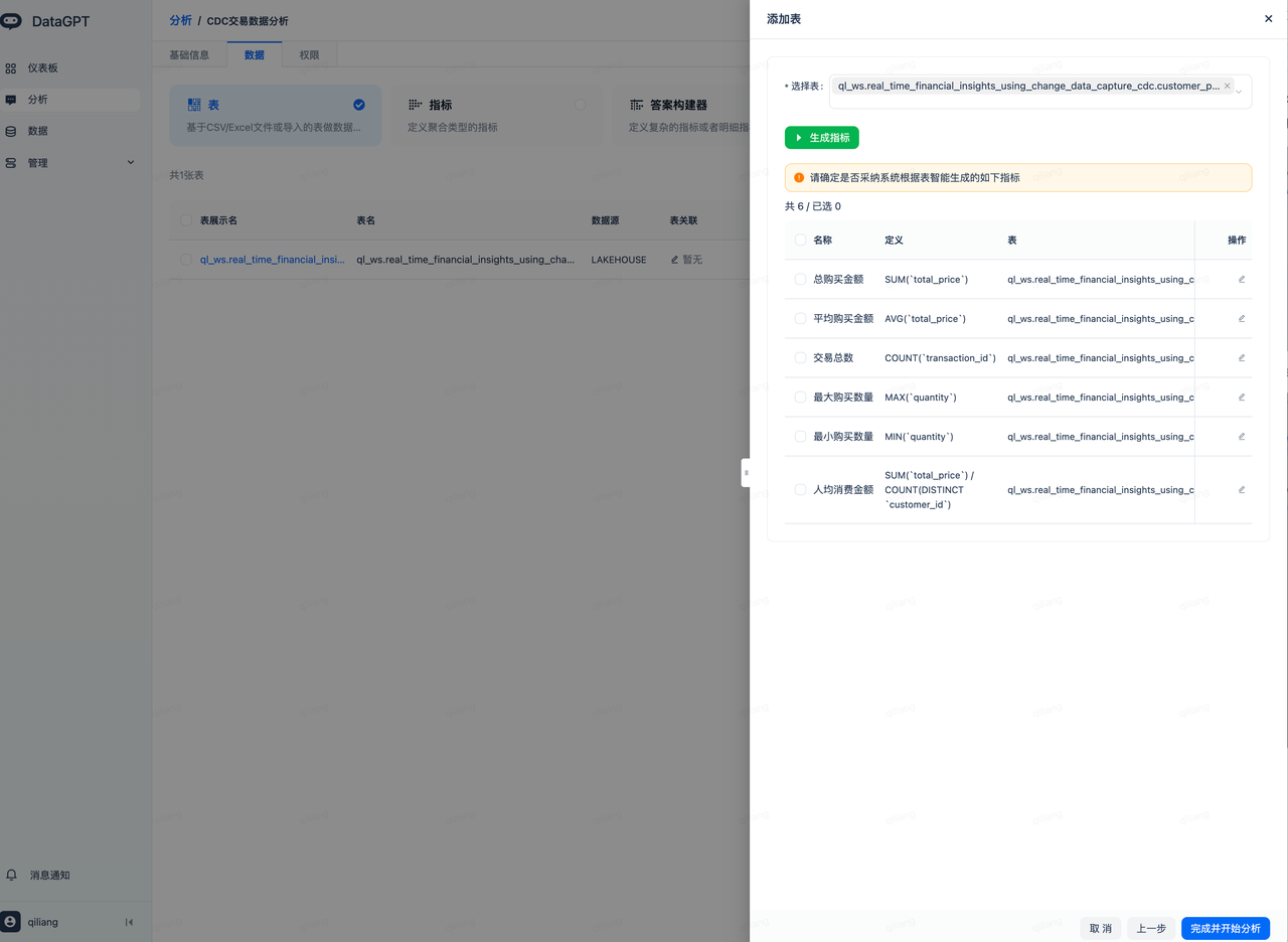 - Adopt the metrics automatically generated by the large model, complete and start the analysis: