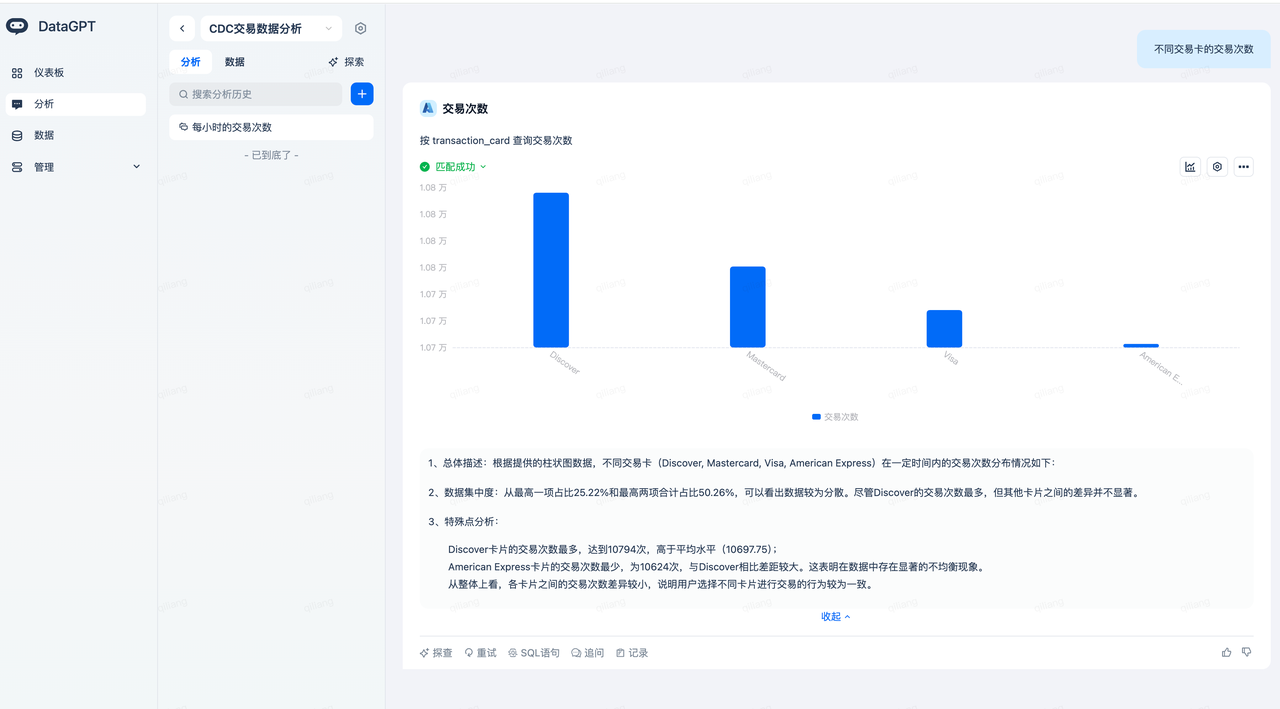 It understands that Mastercard needs to match the transaction card (transaction_card = Mastercard), thanks to DataGPT's automatic indexing of the transaction_card field values.