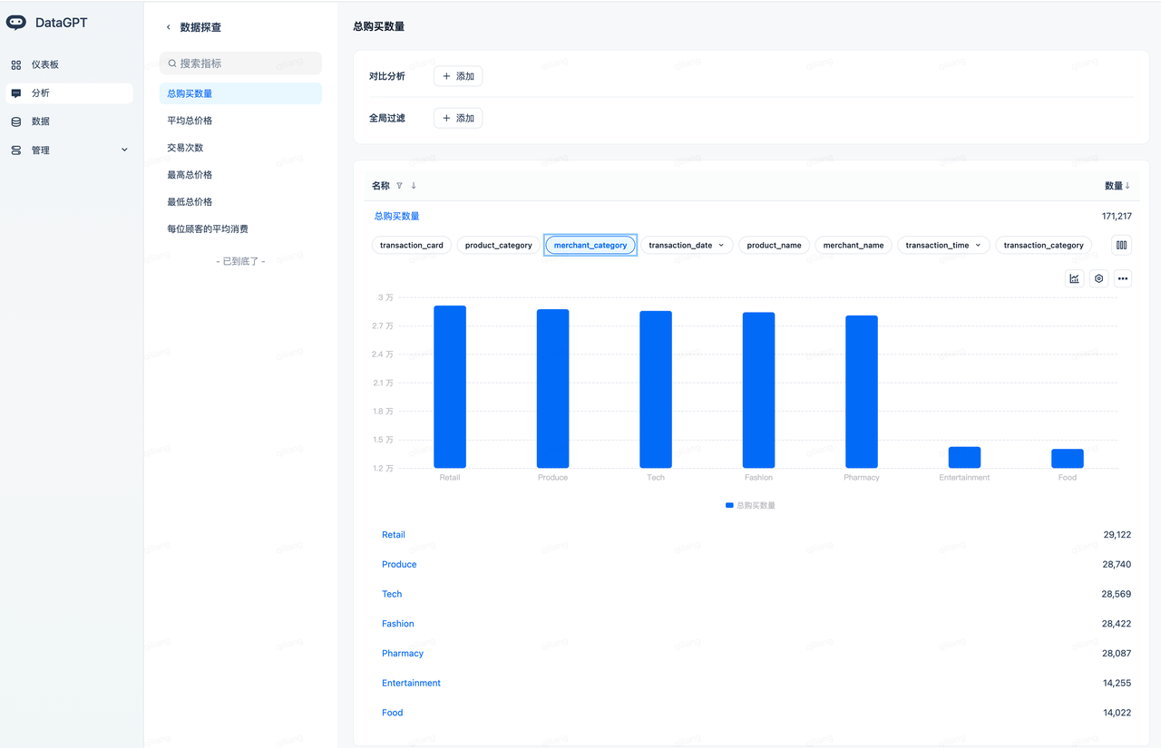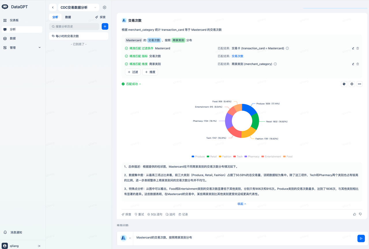 In the Lakehouse table, the product 'Disinfectant Wipes' is stored in English as 'Disinfectant Wipes.' When the user asks about '消毒湿巾,' DataGPT will automatically translate it to achieve precise matching, without requiring the user to input 'Disinfectant Wipes,' fully leveraging the advantages of the large model, making data analysis simpler.