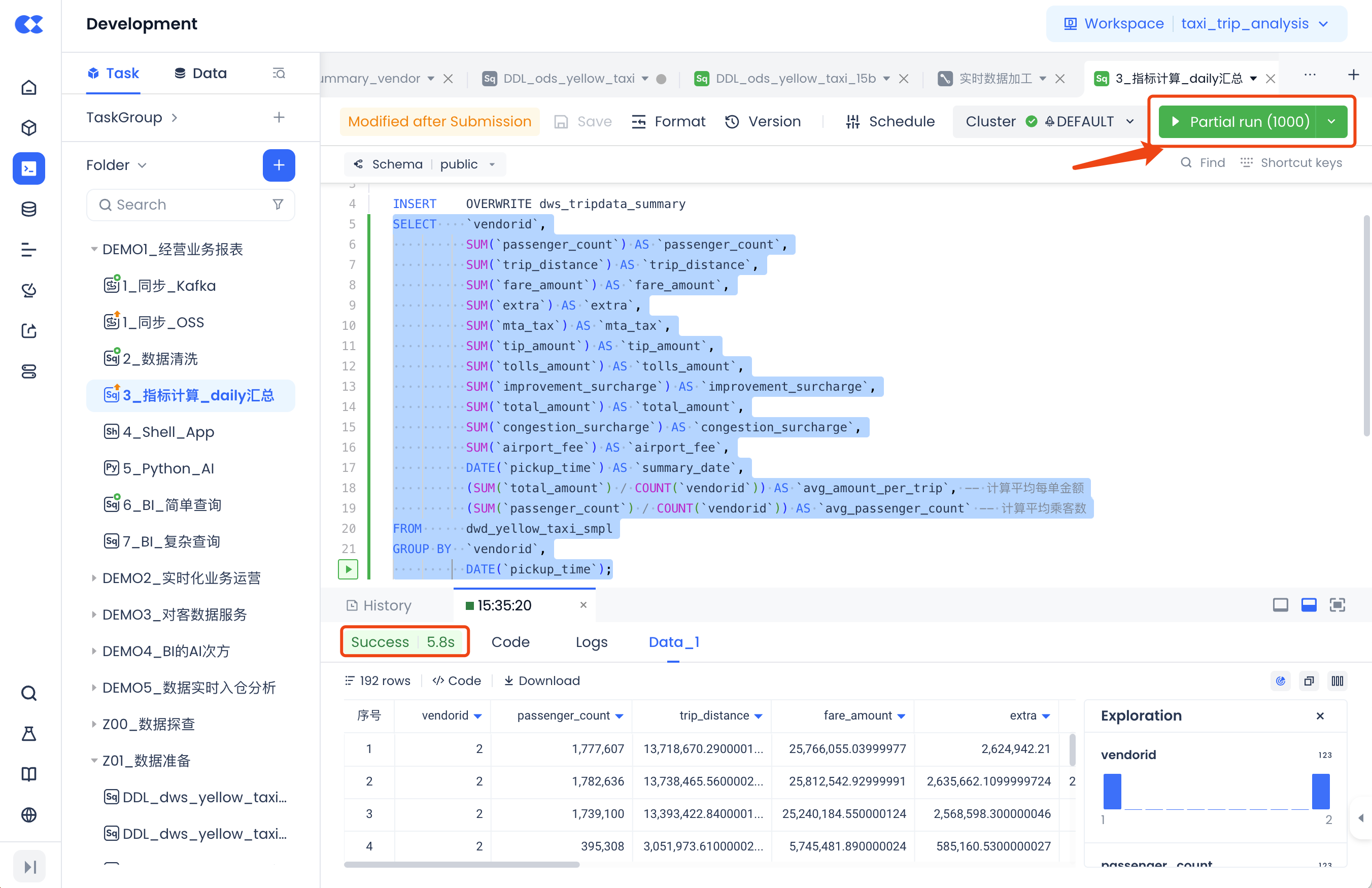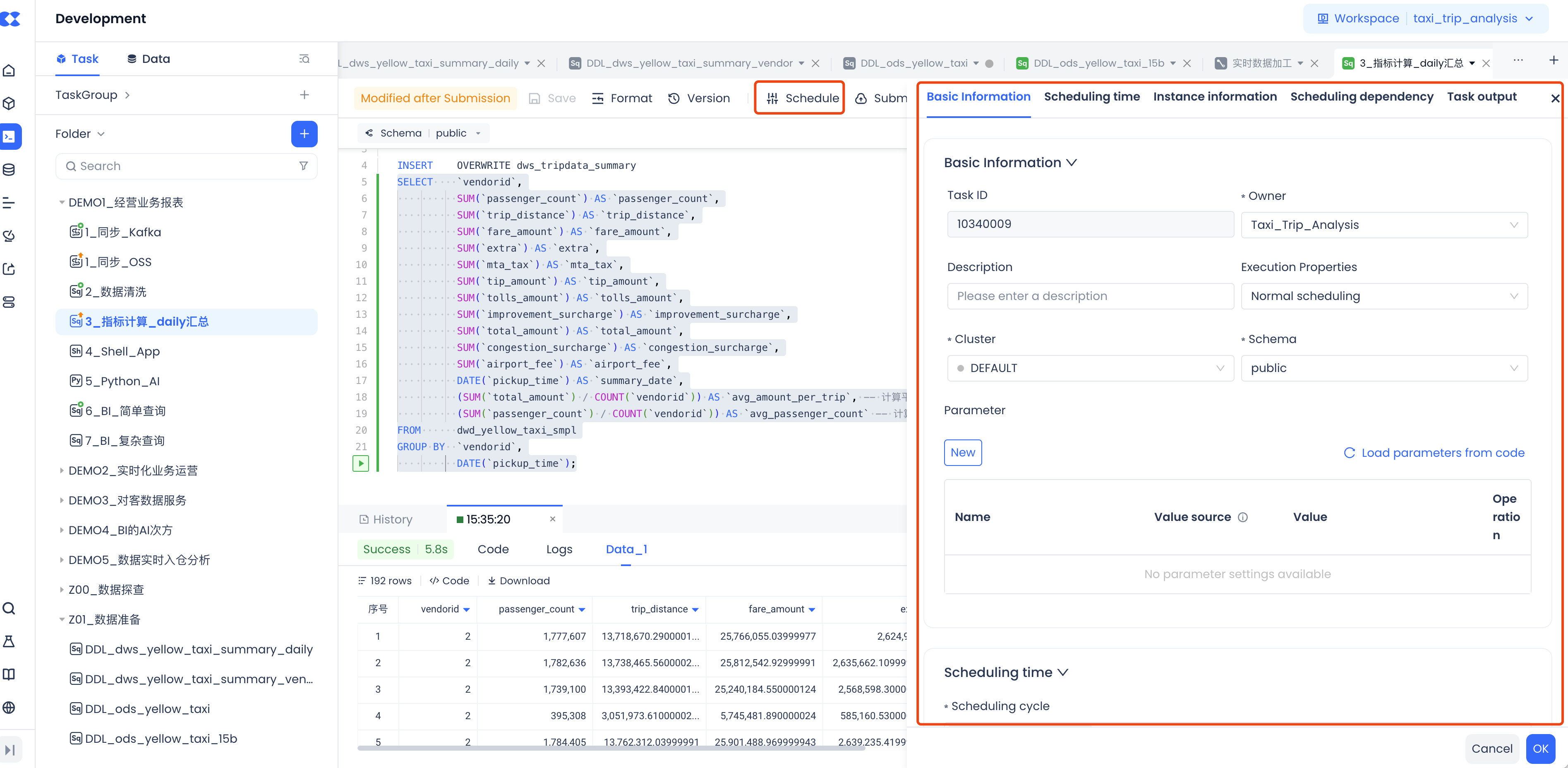 Use the Task Development module to orchestrate the entire pipeline: first, perform data synchronization import, then write SQL code for data cleaning, calculate travel data on a daily basis, compute metrics such as average order amount and average number of passengers, and finally provide data for BI report queries.