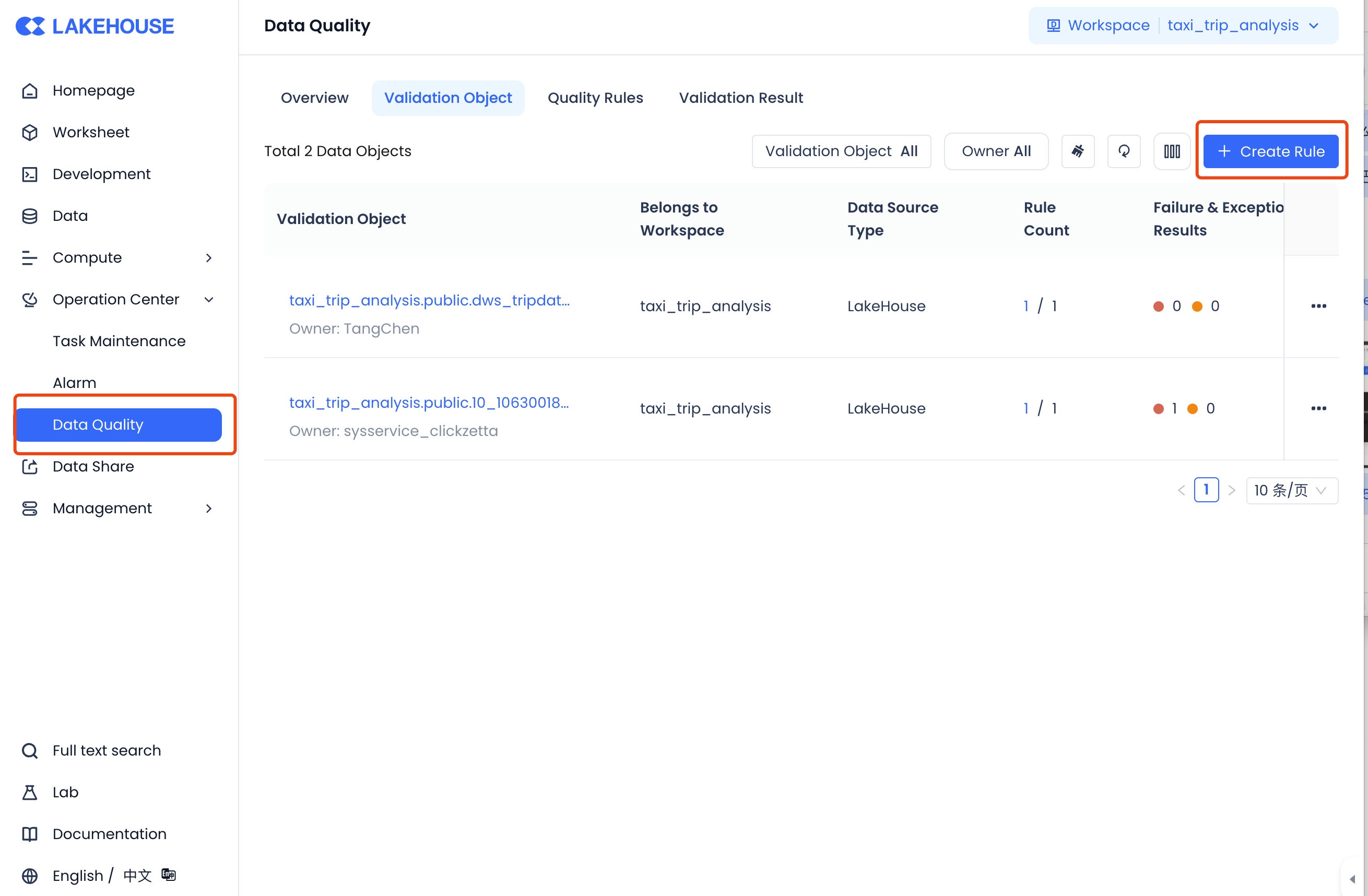 In the Data Quality module, you can configure data quality monitoring rules to monitor the data in the tables produced by the tasks.