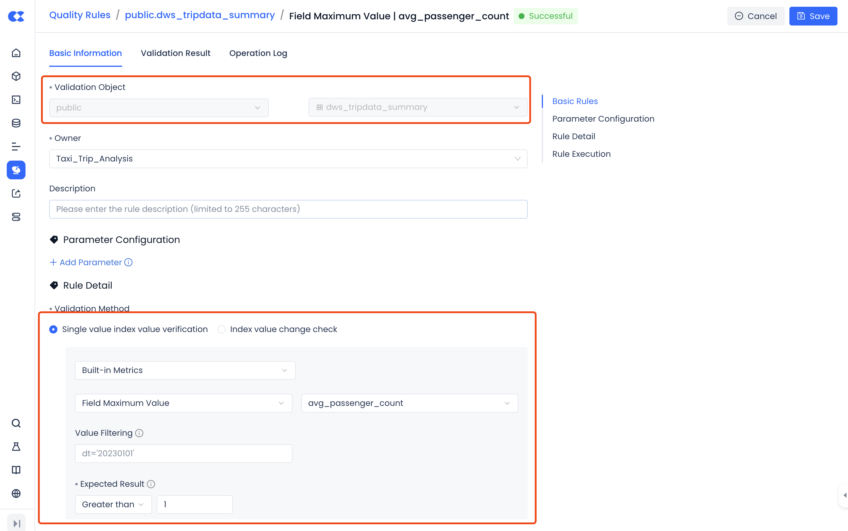 Taking the avg_passenger_count (average number of passengers) field in the dws_tripdata_summary table as an example, monitor that its maximum value is greater than 1 (i.e., there is at least 1 passenger on average), which can be configured as follows.