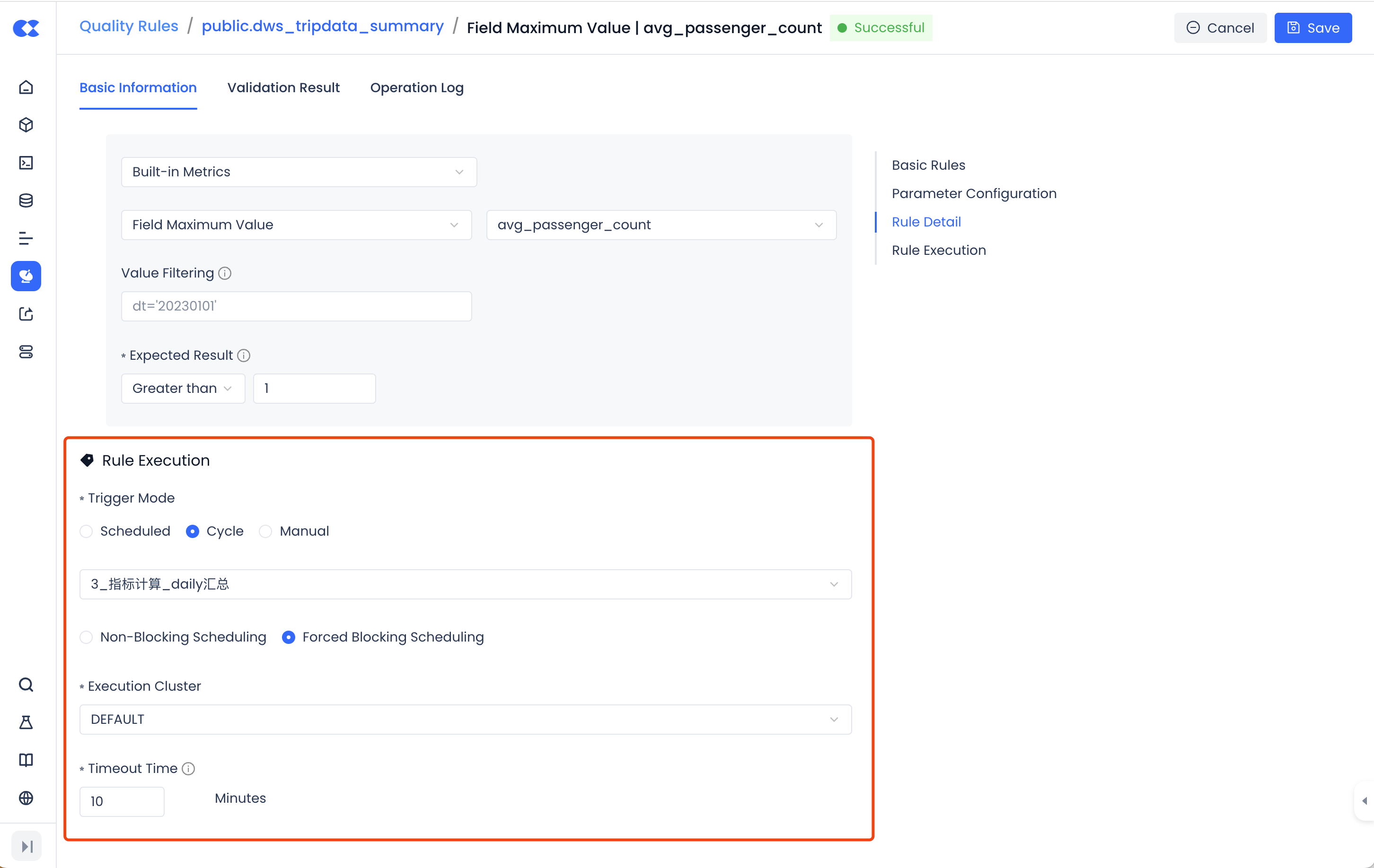 Quality rules support multiple triggering methods, such as manual triggering, scheduled triggering, and periodic task triggering. Manual triggering can be used to test the correctness of rule configurations. In this instance, the quality rule is configured as "periodic task triggering," which means it is triggered by the table's output task to achieve the purpose of triggering quality checks immediately after the task is completed. It is also configured to use the "strong blocking scheduling" mode, which means that if the quality rule check fails, the instance status of the associated scheduling task will also be set to fail, thereby blocking the scheduling operation of downstream task instances and preventing the spread of data issues.