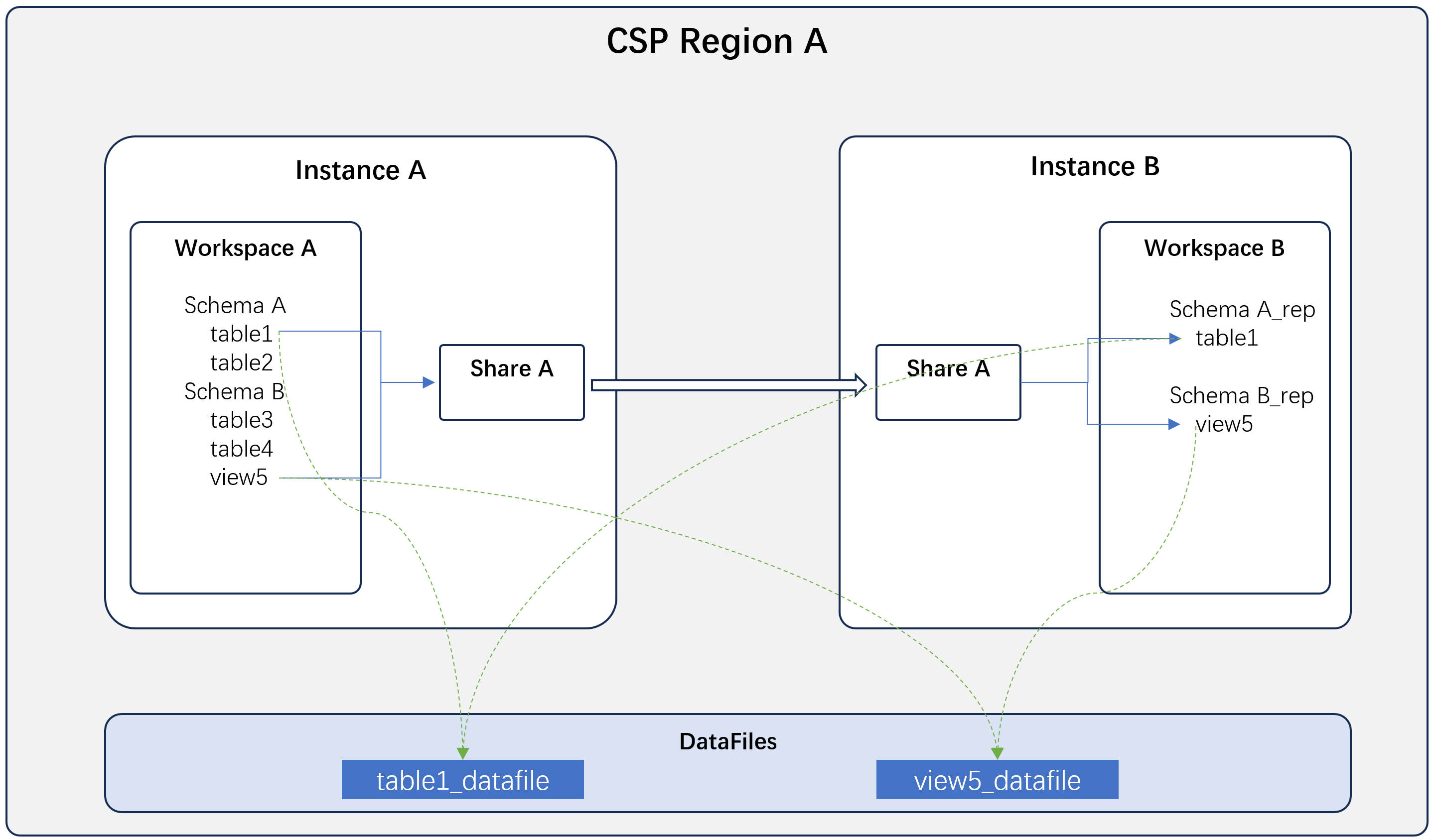 Data sharing is a no-copy data sharing feature provided by Singdata Lakehouse, used for data authorization across accounts or service instances within the same service region. In Singdata Lakehouse, users can share specified tables or views with other accounts in the same service region through the share object, without actually copying the data to other accounts.
