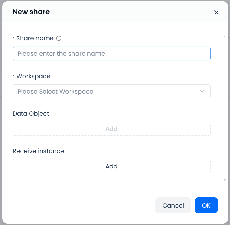 - The workspace that creates the share object determines the range of data objects that can be added to the share object. Adding data objects across workspaces is not supported.
