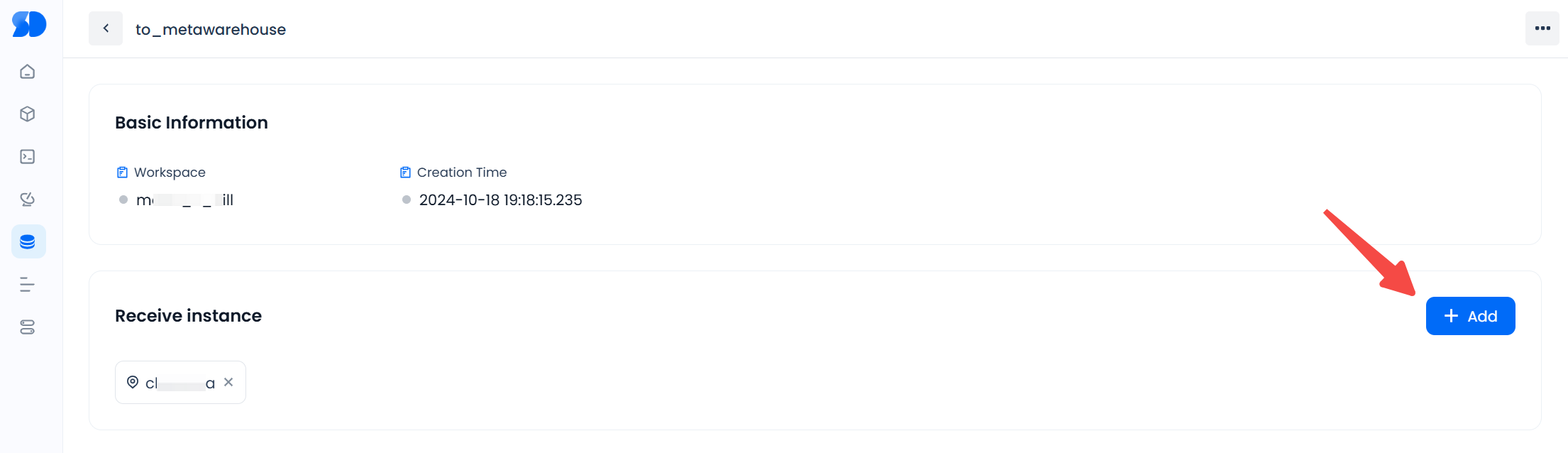 In the receiving instance row, click "Add." Enter the name of the service instance that needs to receive the data. The service instance name is globally unique in the Lakehouse service. The service consumer user can find their service instance name on the right side of the homepage or in the URL of the service instance and provide it to the sharer for configuration.