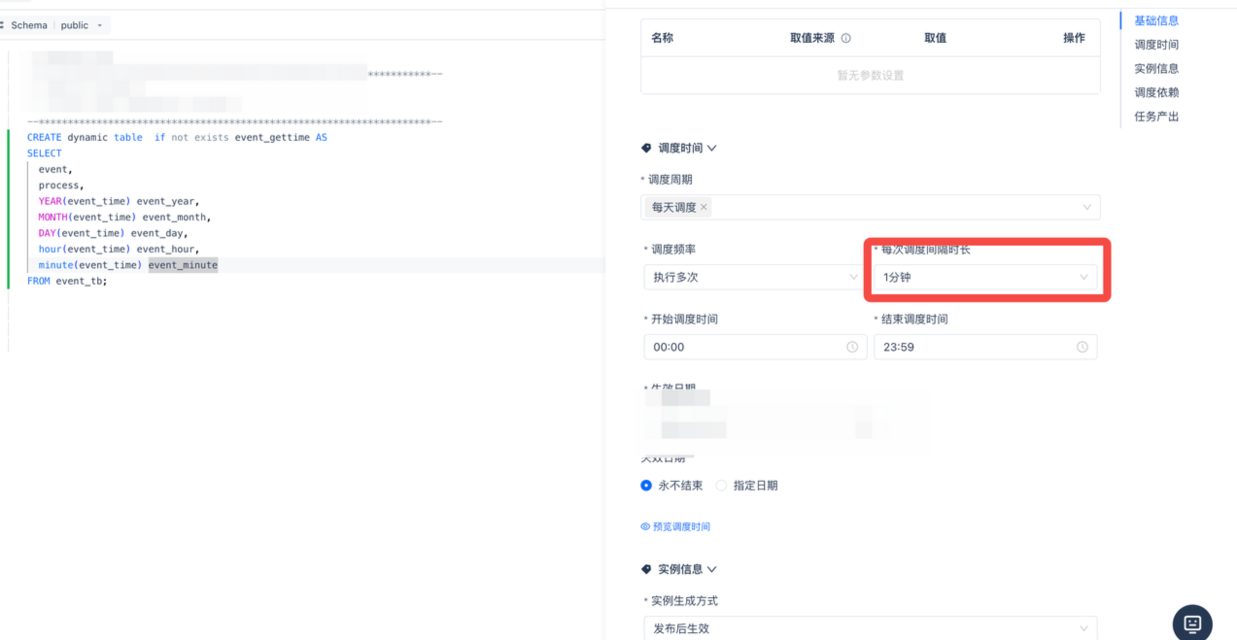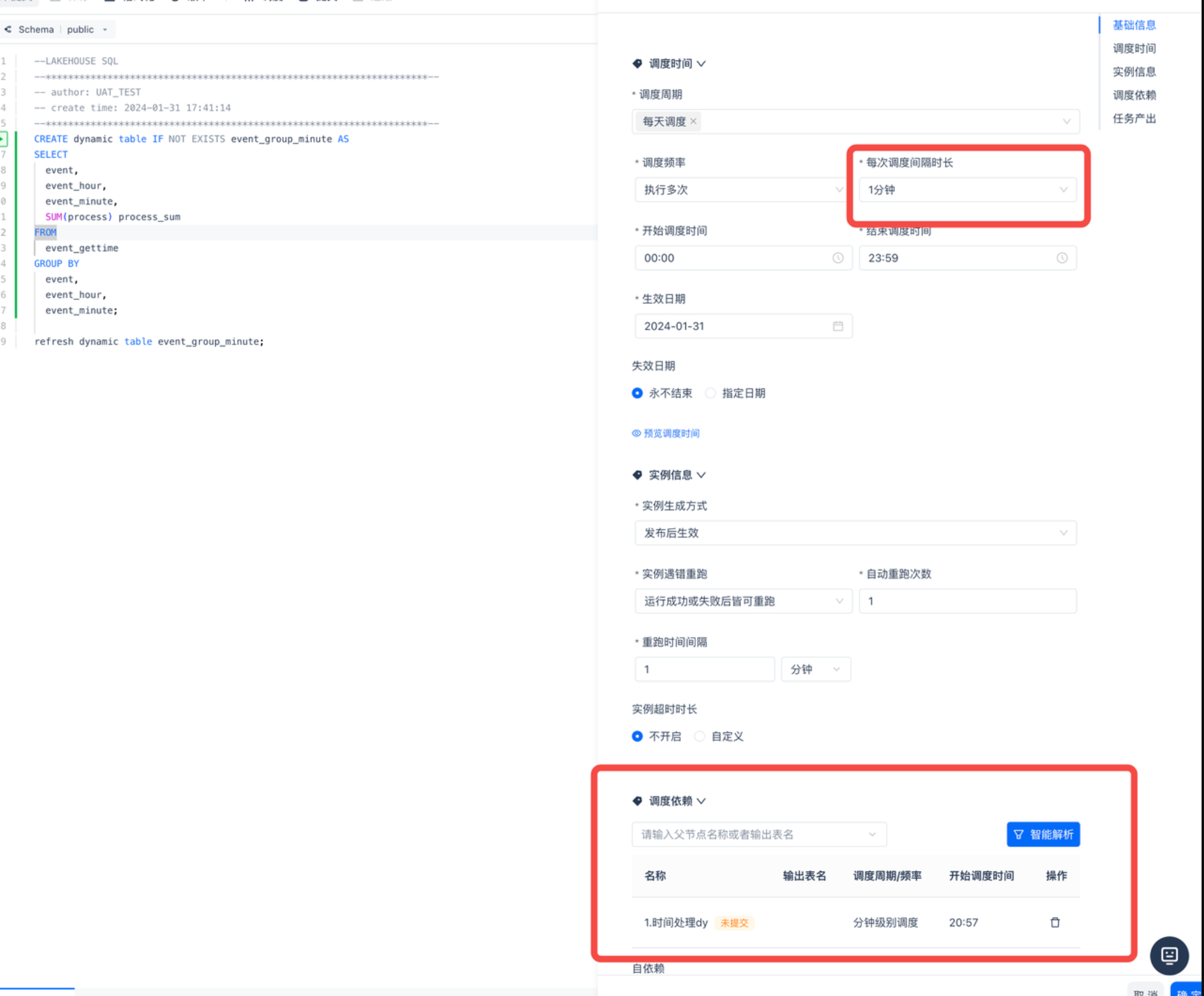 | Define scheduling in Lakehouse Studio | You can configure scheduling through a visual interface in Lakehouse Studio, refer to the task development scheduling documentation for specific configuration methods. Currently, the refresh interval is limited to one minute. | Visual configuration, user-friendly. Supports scheduling dependency configuration to ensure the upstream refresh is completed before refreshing the downstream. Supports single-node operation monitoring, such as failure alerts, timeout alerts, etc. | |