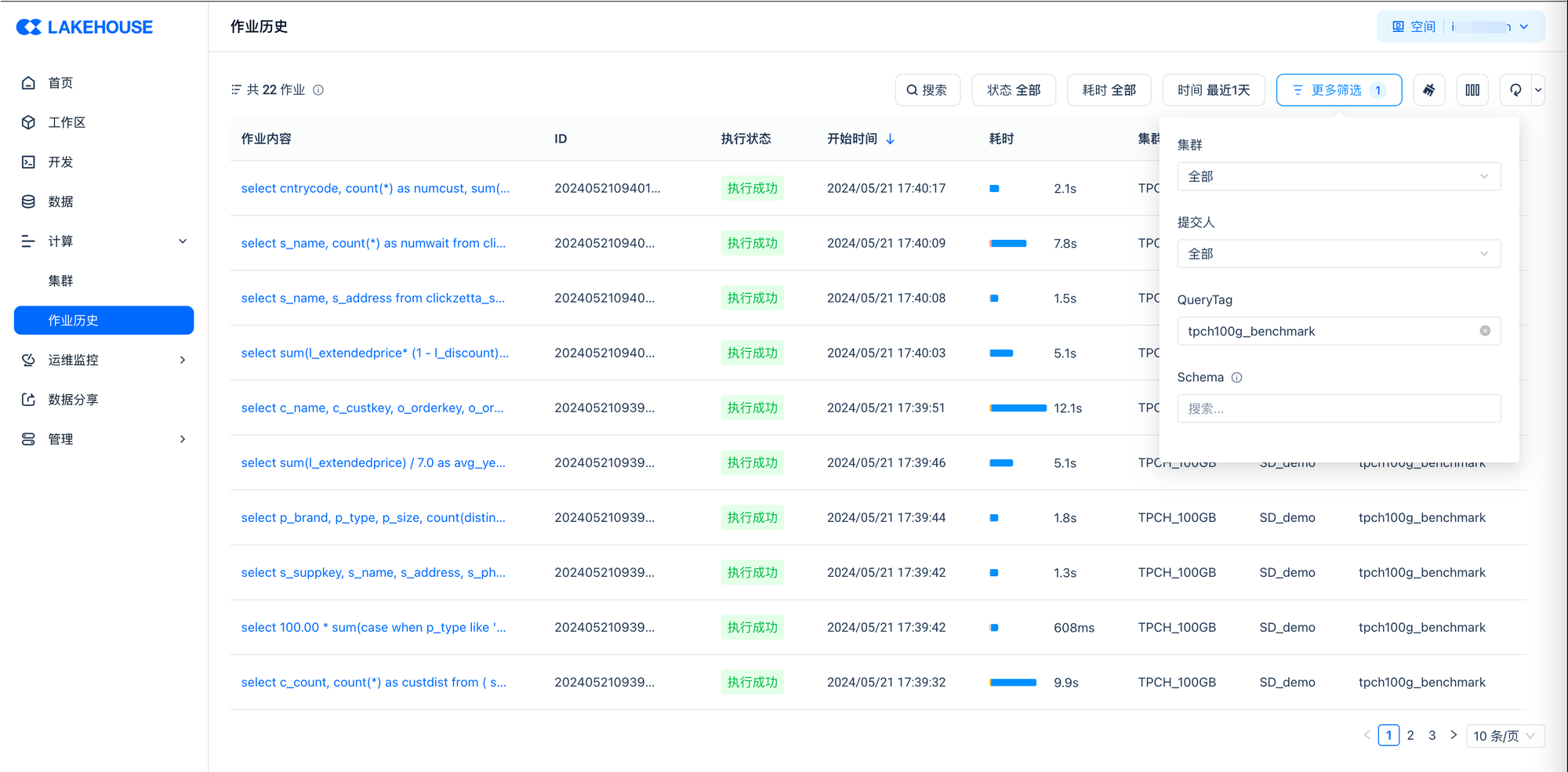 If you want to see the execution details of each of the 22 queries, you can access Compute → Job History, filter the query history by the query tag "tpch100g_benchmark" and view it.