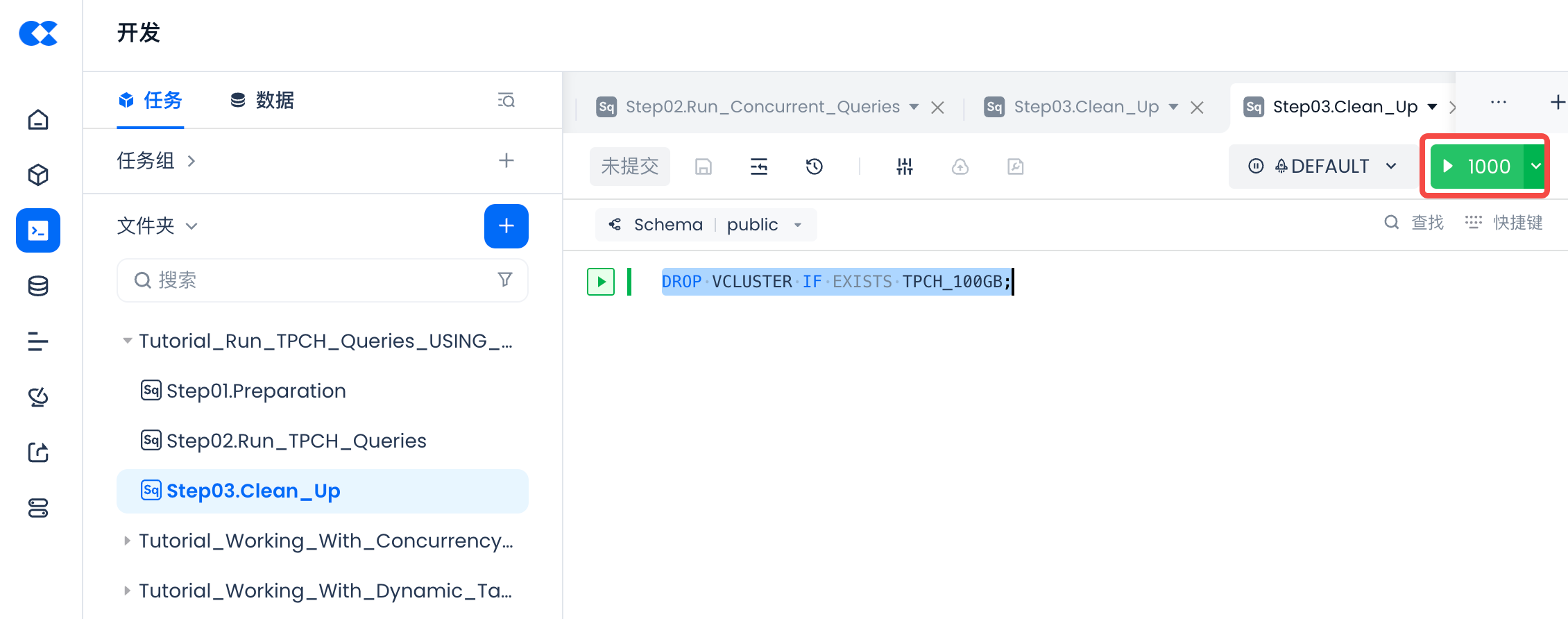 Open the "Development" module [Tutorial_Run_TPCH_Queries_USING_SQL->Step03.Clean_Up] SQL script file, and execute the script to delete the test cluster for this tutorial.
