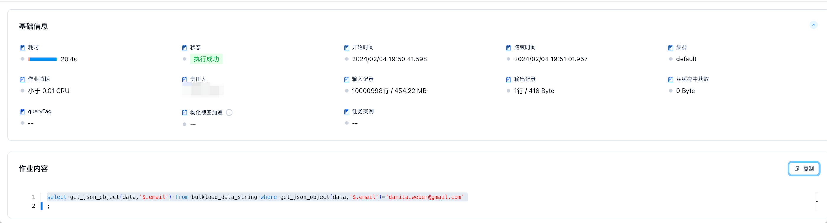Using json to store data takes 531ms to execute. Since column pruning is performed during reading, the data size is also reduced. As shown in the figure below, only 153MB of data needs to be read, while string type requires reading the full 454MB of data.