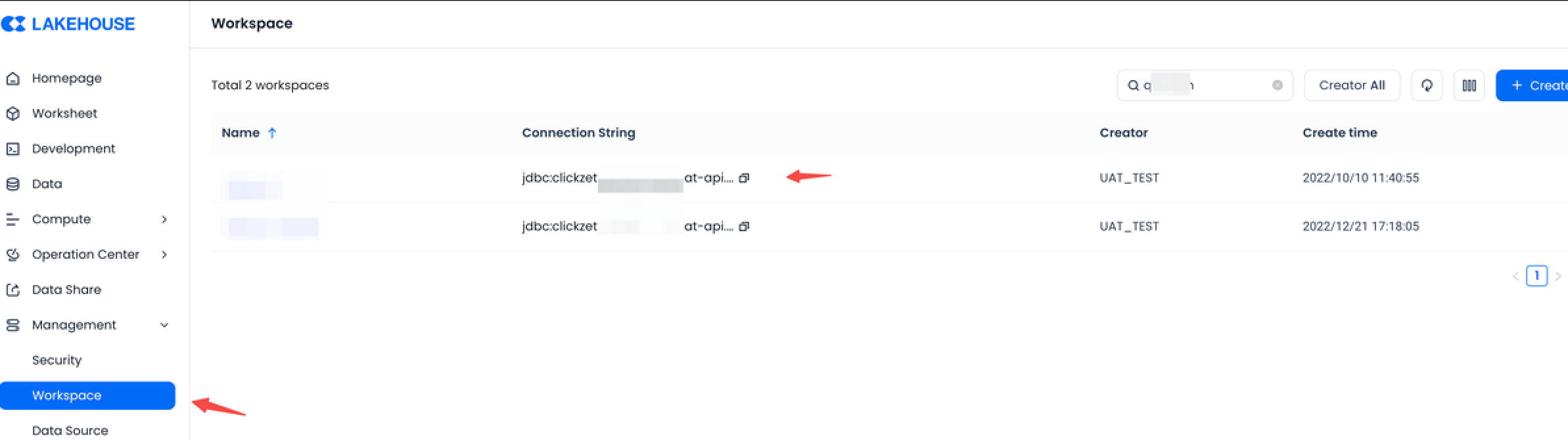 Prepare the username. When using the MySQL protocol connection address, only one URL can be passed, making it impossible to concatenate the Lakehouse instance name and workspace name. Therefore, the instance name and workspace name need to be concatenated into the username.
