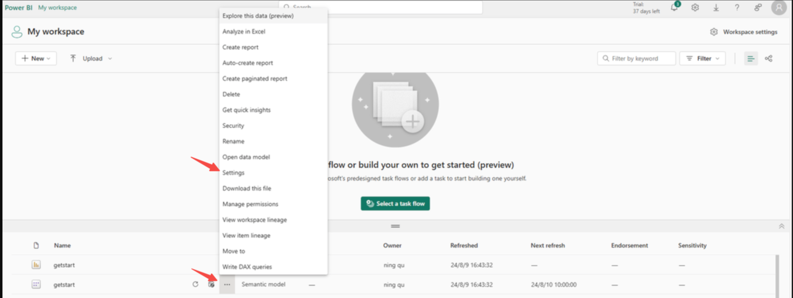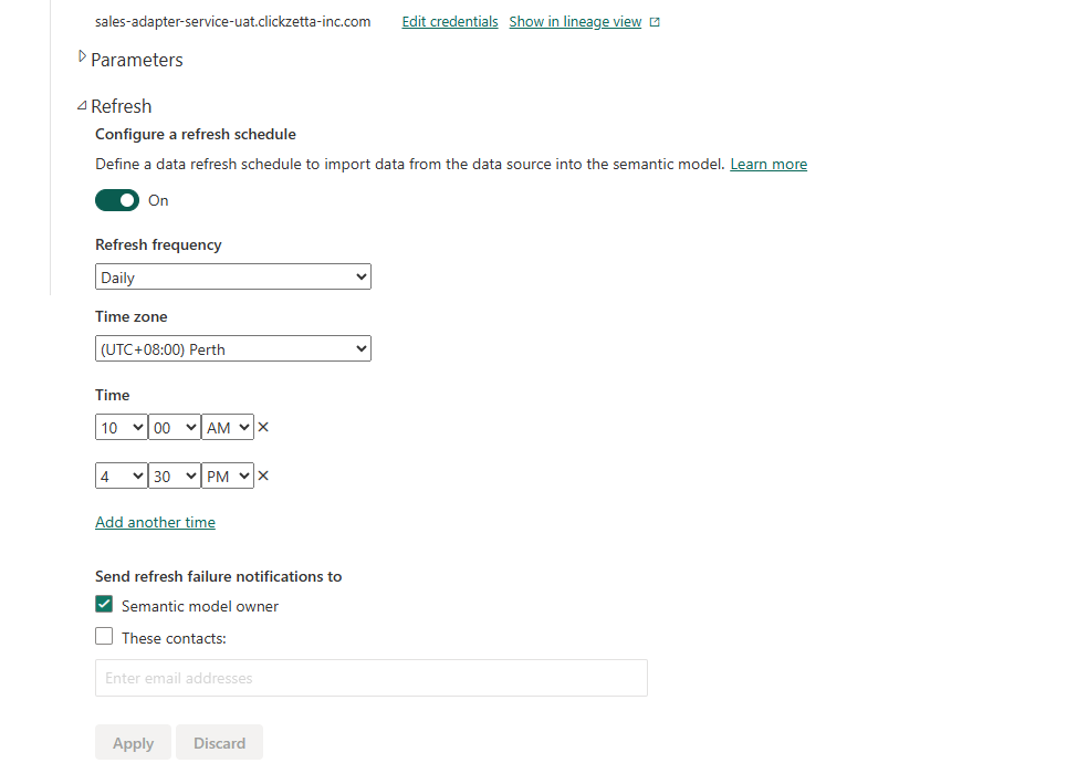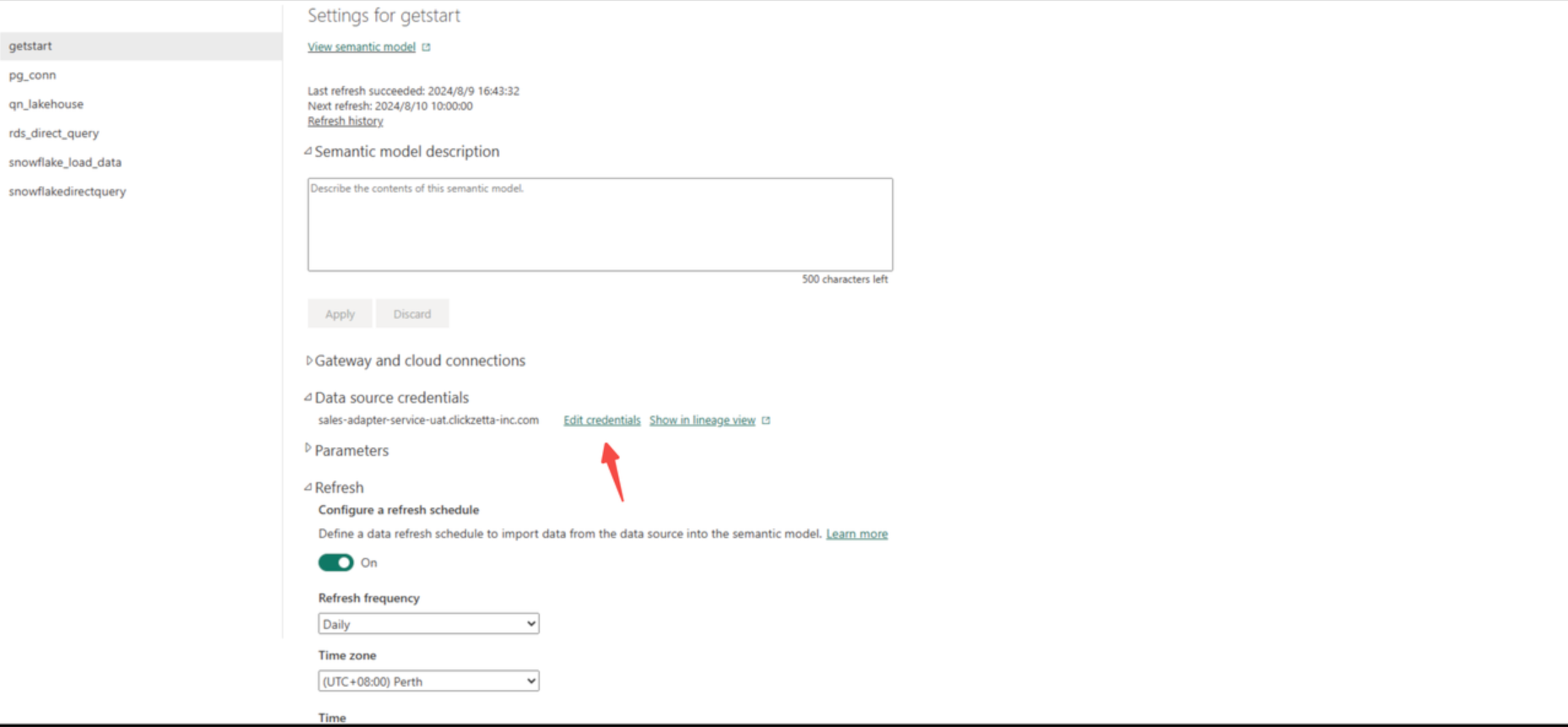 Find the recently published dashboard in Power Service and configure scheduling information and password authentication information