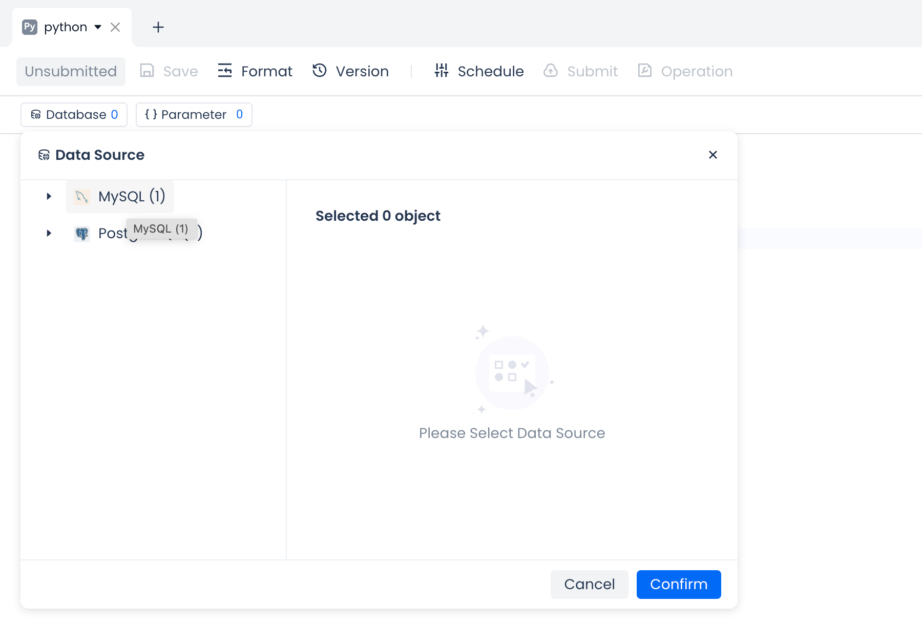 Development -> Python Task -> Data Source. For Postgres and MySQL data sources, they must be created and tested for connectivity underManagement -> Data Sourceto ensure successful connection. - When using Lakehouse data sources, the