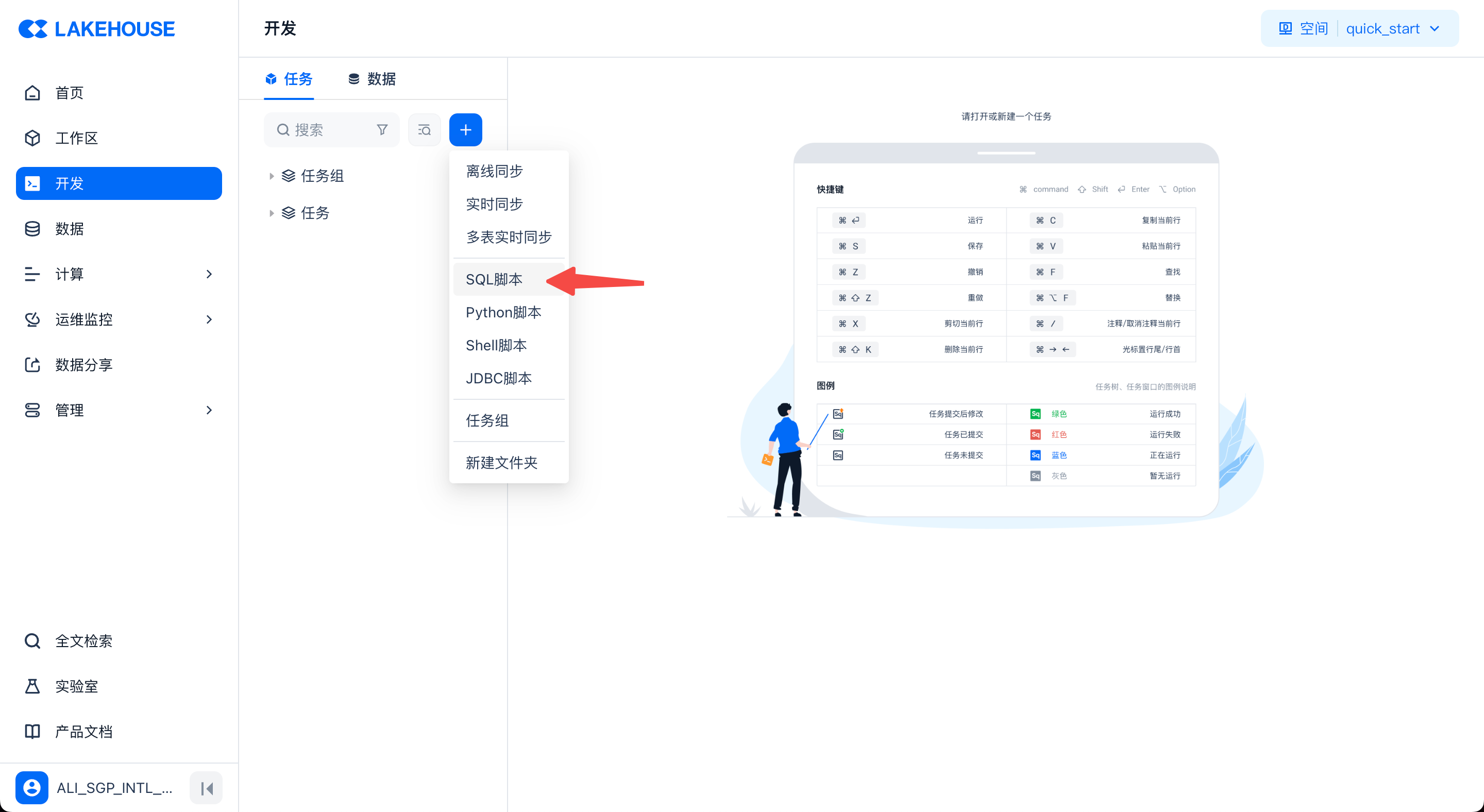 In the page navigation, click "Development" to enter the data development interface. Under "Tasks," create a new SQL task file by selecting "SQL Script" from the new menu.