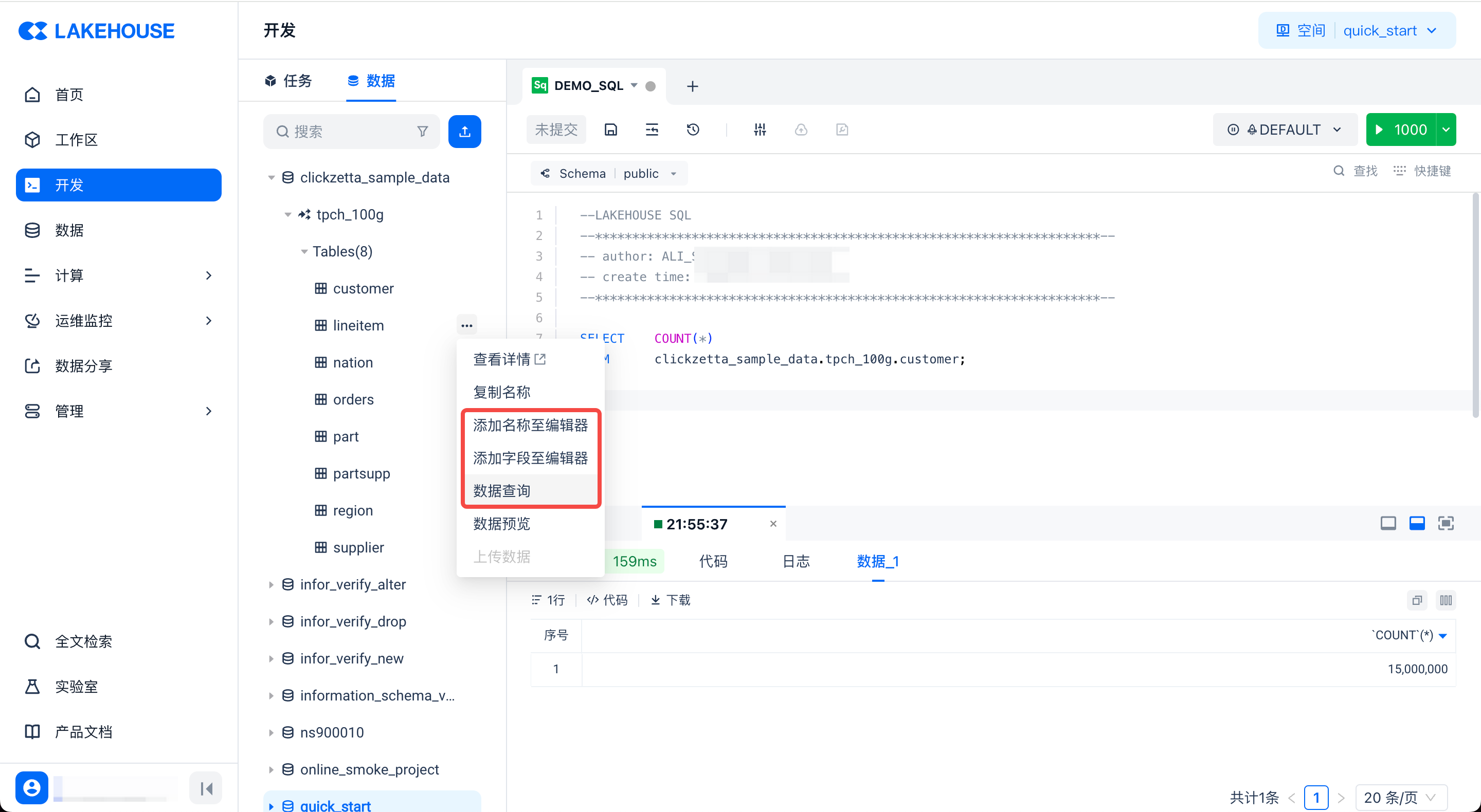 When writing code in the editor, you can also switch to the data tab to quickly browse and use data. After finding the required table, you can quickly insert the table name, field name, or directly generate a query sample SQL from the operation menu: