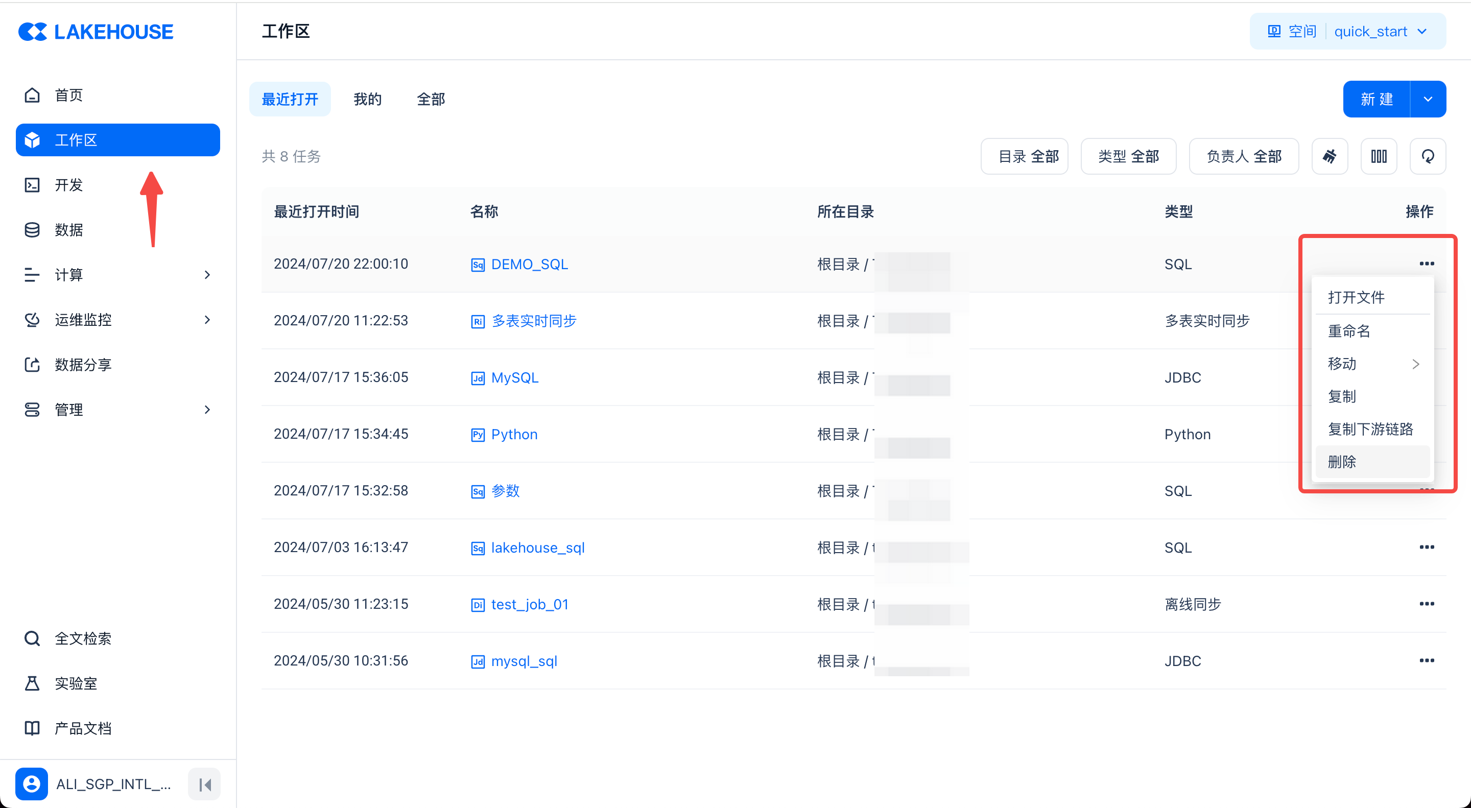 The workspace displays the files you have recently opened, as well as the tasks you manage and all task files. Here you can quickly open files or perform management operations such as renaming, moving the file directory, copying, and deleting.