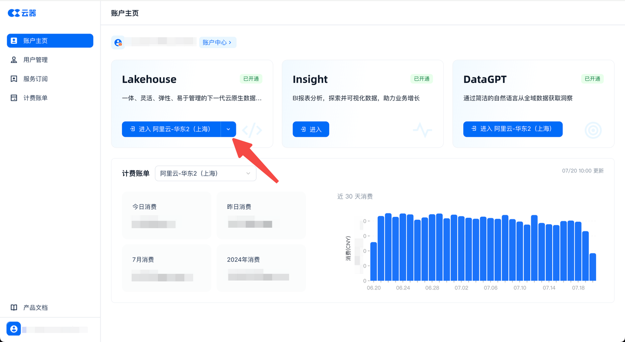 In the "Account Home" of the control center, click on the activated service instance to enter the homepage of the service instance.