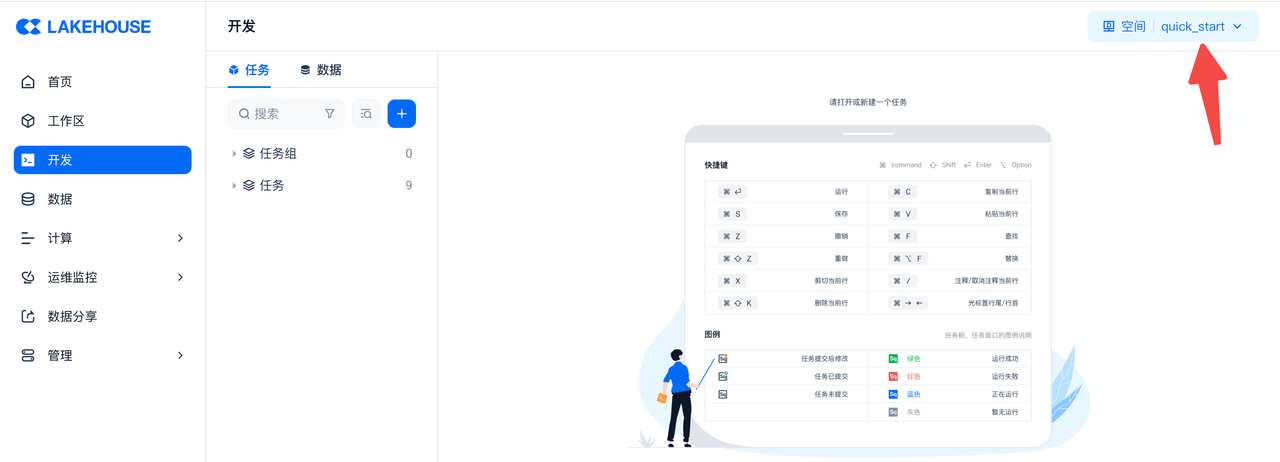 After the service instance is activated, the system will create a workspace named "quick_start" by default. You can directly use this workspace for task development and other work.