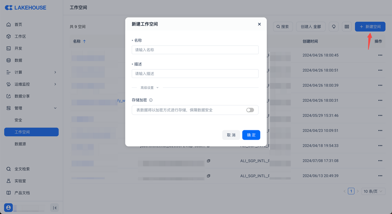 Enter the "Management - Workspace" menu, click "New Space" on the workspace management page, fill in the required information, and create it.