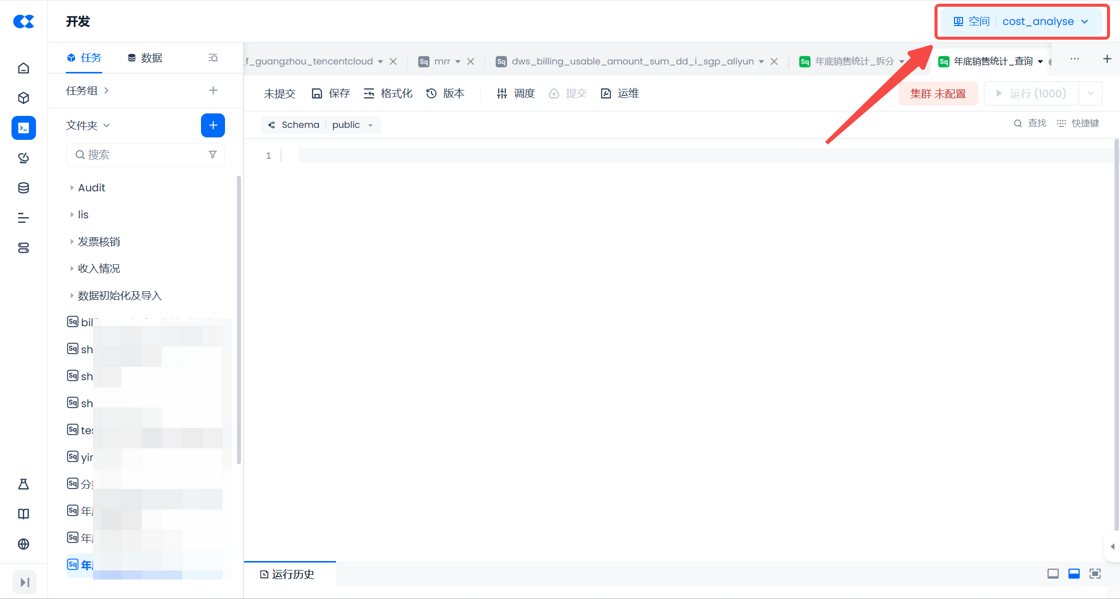 On the homepage of the service instance, click on any function in the left function menu such as "Development", "Computing", "Operations Monitoring", etc. The workspaces that the current account has permission to access will be listed in the upper right corner of the page, supporting switching. When using a single workspace, it defaults to the only workspace within the service instance. At this time, all task scripts and scheduling jobs are within this workspace.