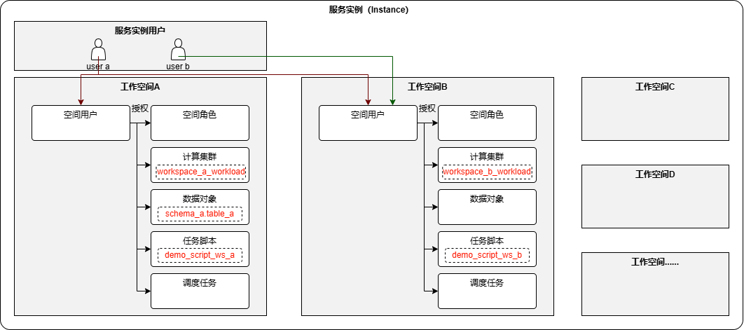 To achieve both isolation and ease of data exchange within a service instance, permissions between different workspaces are isolated: a service instance user needs to be added to a workspace by the workspace administrator role (workspace_admin) to be authorized and use the data or computing resources within the workspace.
