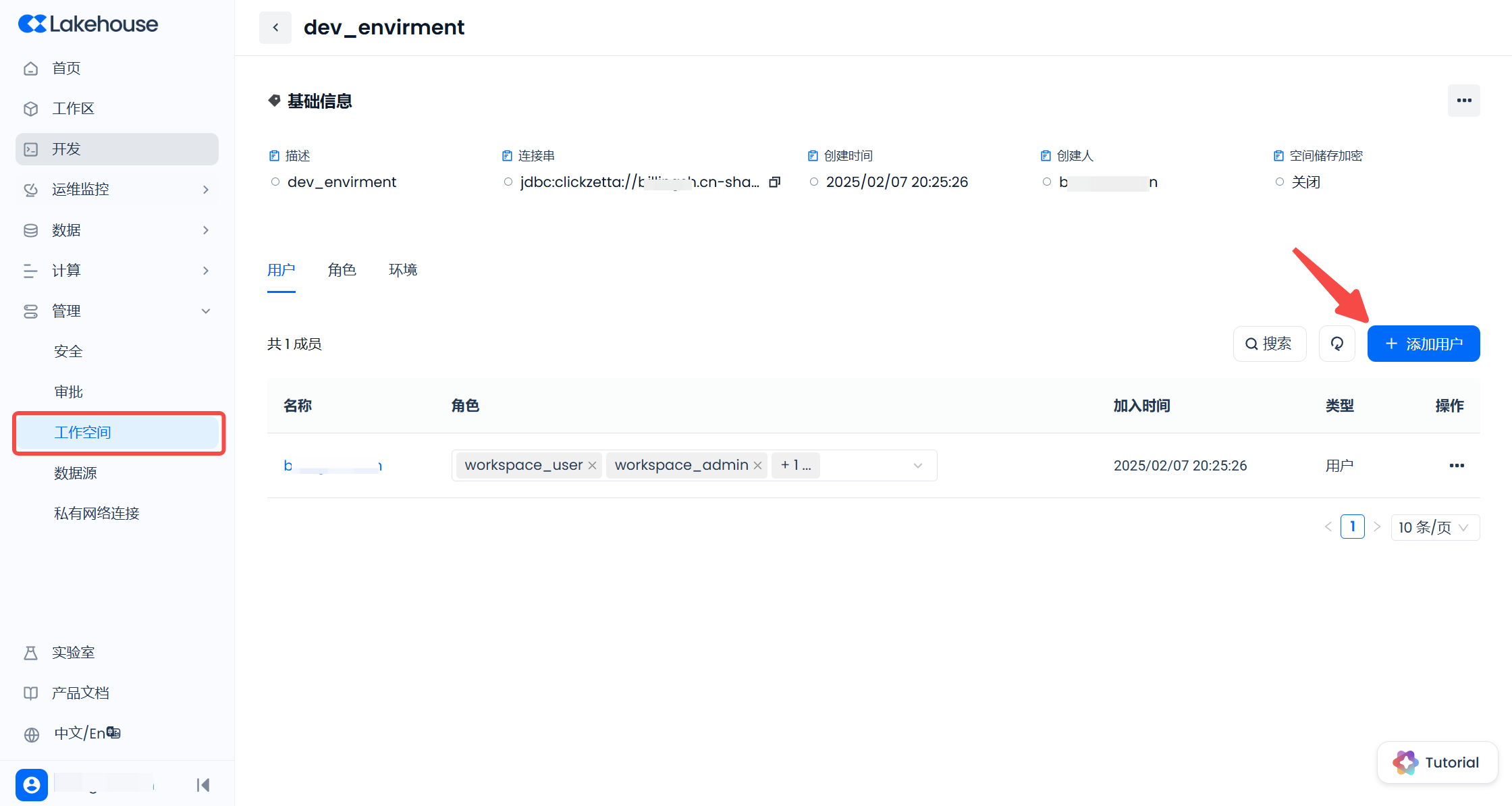 Continue using the user who created the dev_environment workspace, click on "Management" - "Workspace" in the left menu to enter the workspace list, find the dev_environment workspace, and click to enter. On the "Users" tab of the workspace details page, click the "+ Add User" button on the right: