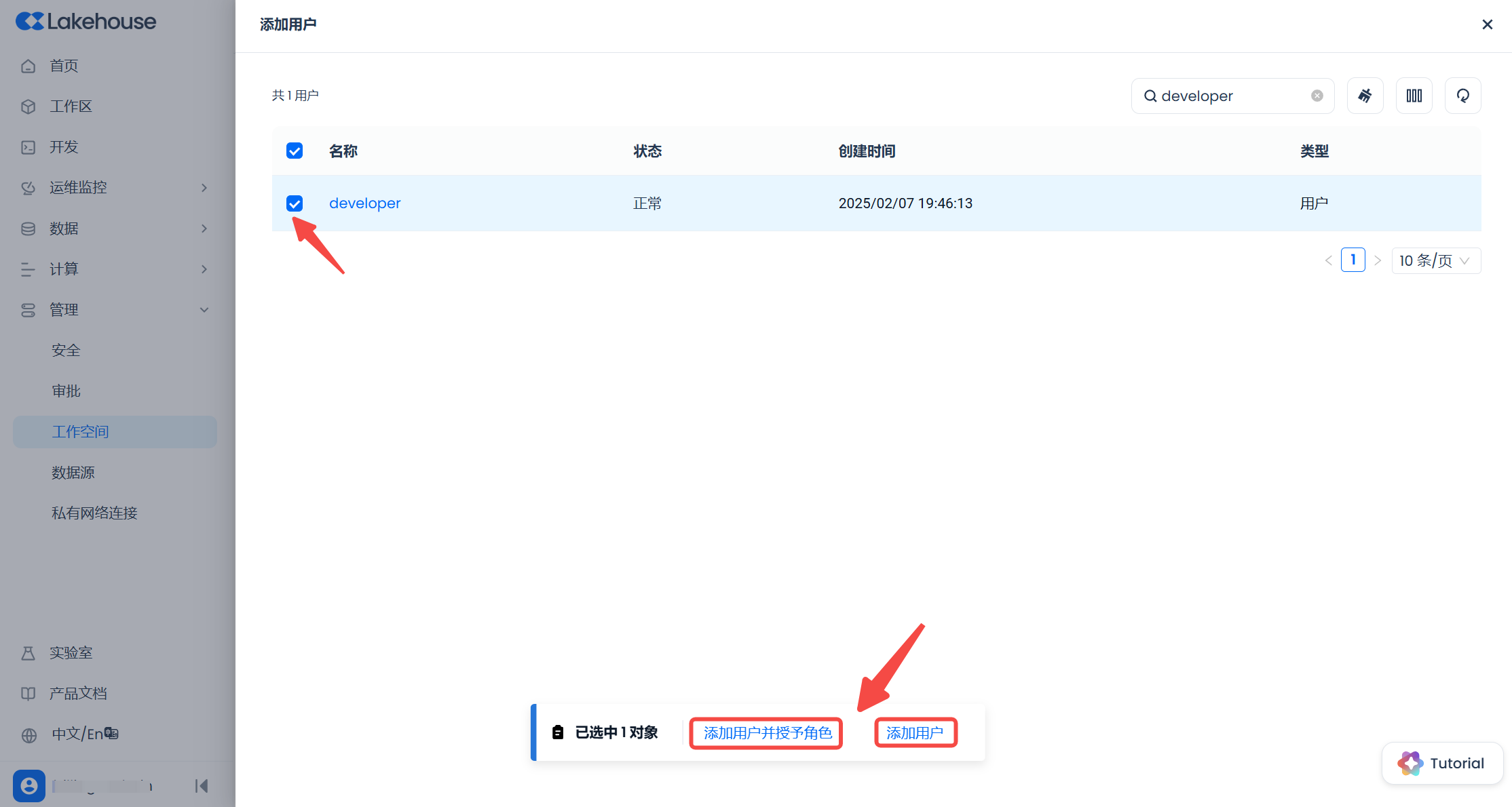 At this point, there are two buttons below, click the right "Add User" button to only perform the operation of adding the user to the workspace without any authorization. Click the left "Add User and Grant Role" button to further select the role to be granted. Suppose we click the left "Add User and Grant Role" button: