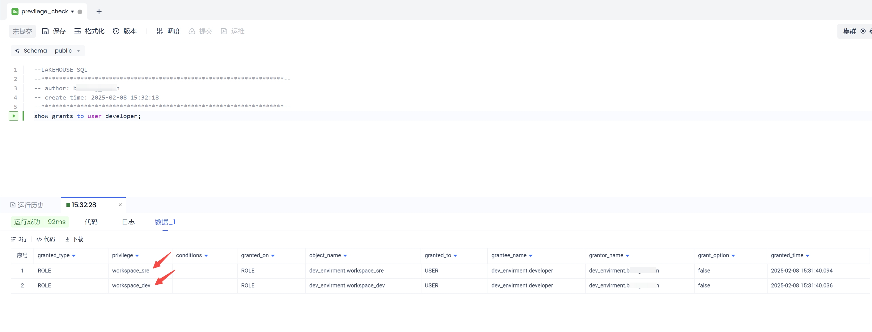 After completing the above operations, we have completed the operations of adding the developer user to the workspace and granting authorization. The effect is equivalent to the authorization executed by the above SQL.