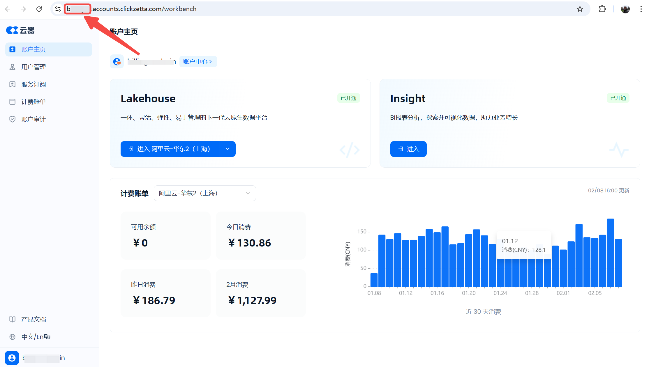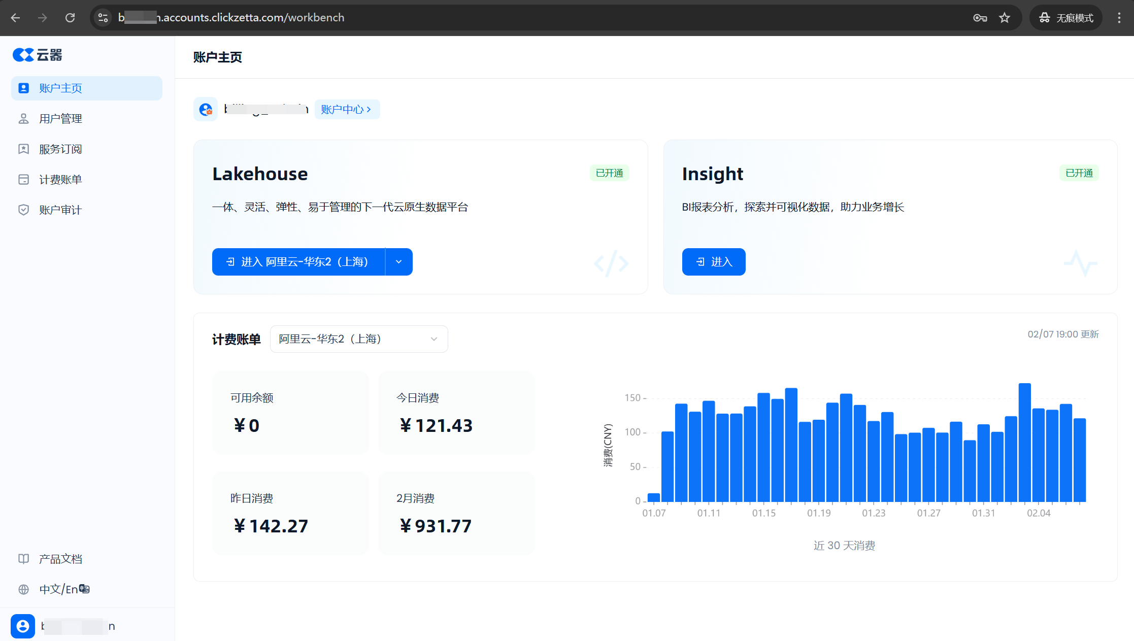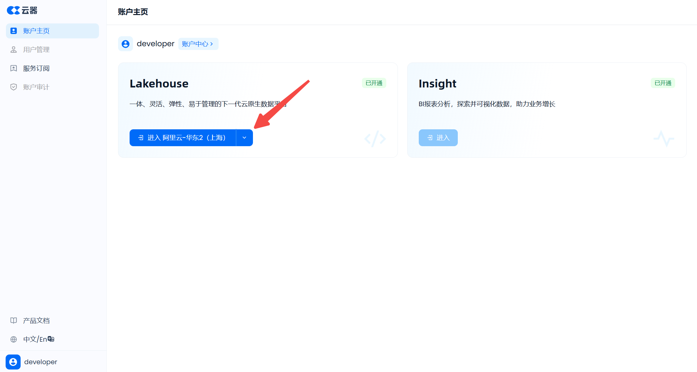 Now, use the developer user to log in at the .accounts.clickzetta.com/login URL, and click the "Enter" service instance button under the "Lakehouse" product to enter the Lakehouse service instance.