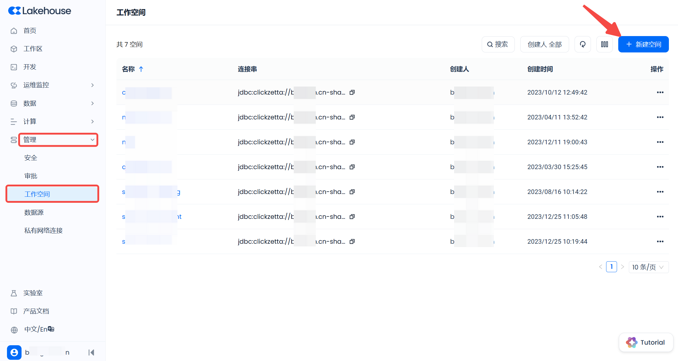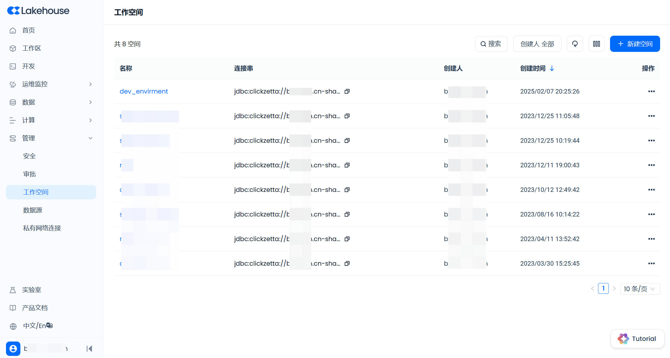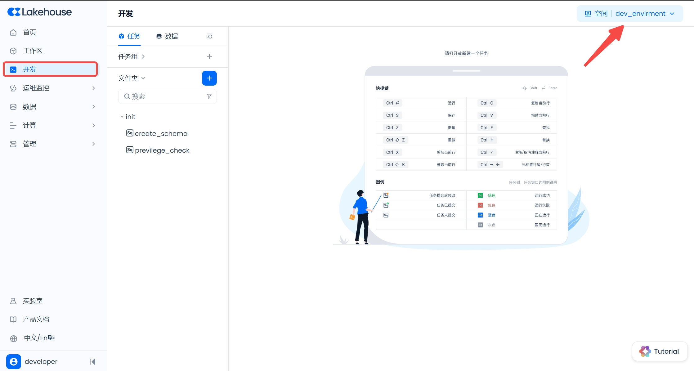 In Lakehouse, a workspace is used to isolate computing resources and data, forming a relatively independent data development environment to avoid resource conflicts or data misoperations. After opening a Lakehouse service instance, the system will create a workspace named quickstart by default. Here, to fully introduce the team usage method, we will create another workspace: dev_envirment: