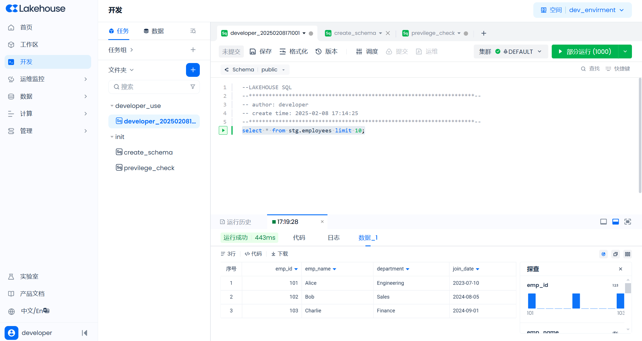 After completing the above operations, both the developer and analyst users can log in to Lakehouse and have the corresponding permissions to perform data development or queries. Below, we will use the developer user to log in to the system.
