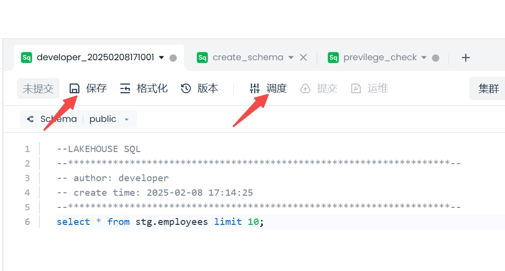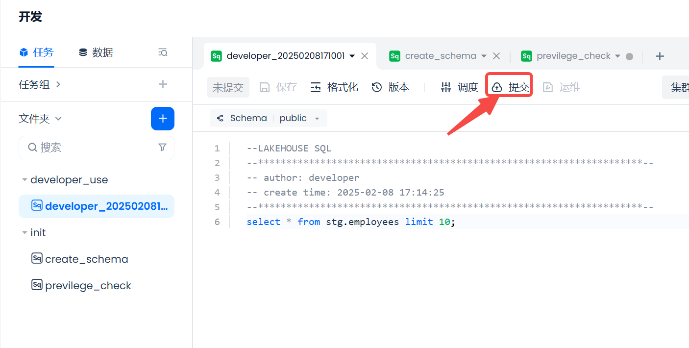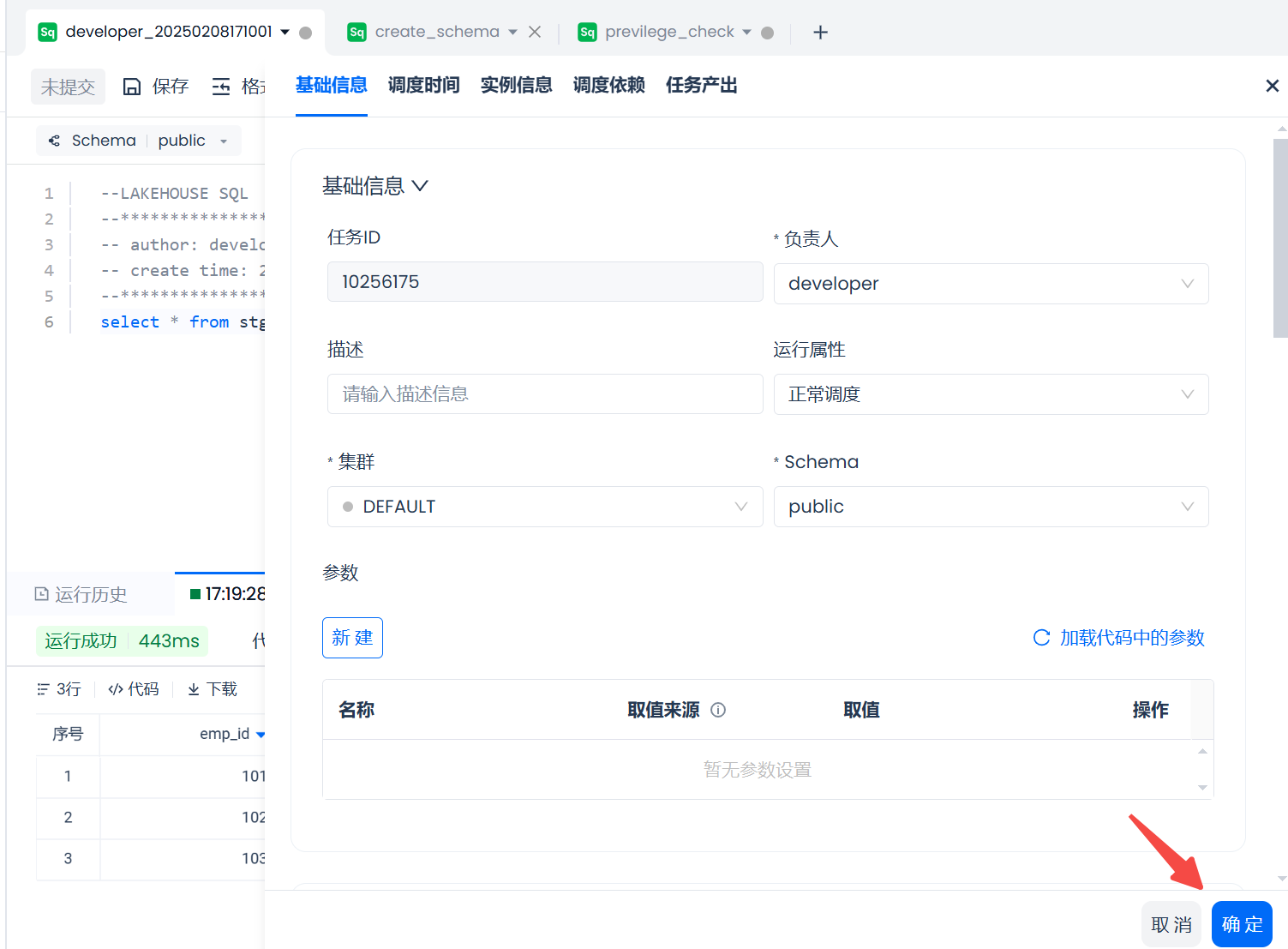 The above completes the process from creating a user, authorizing, to using the new user to develop SQL tasks and submitting them for periodic scheduling.