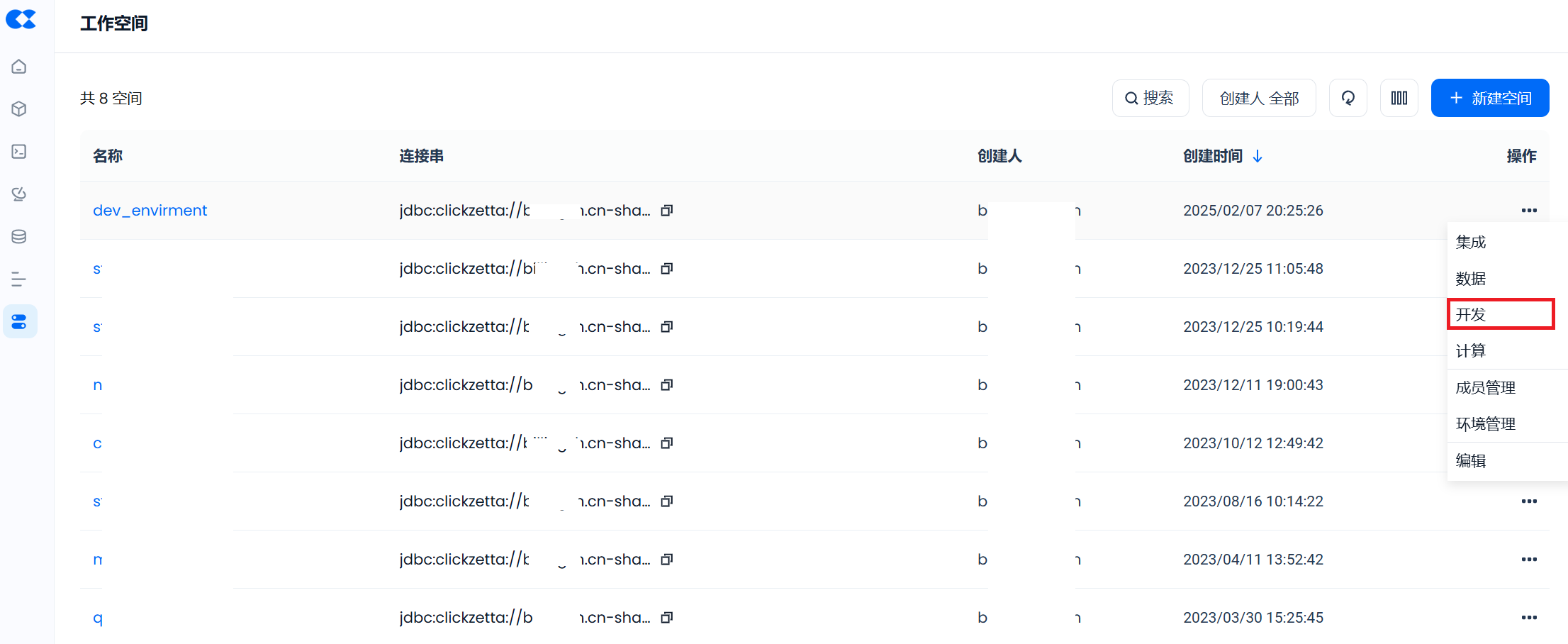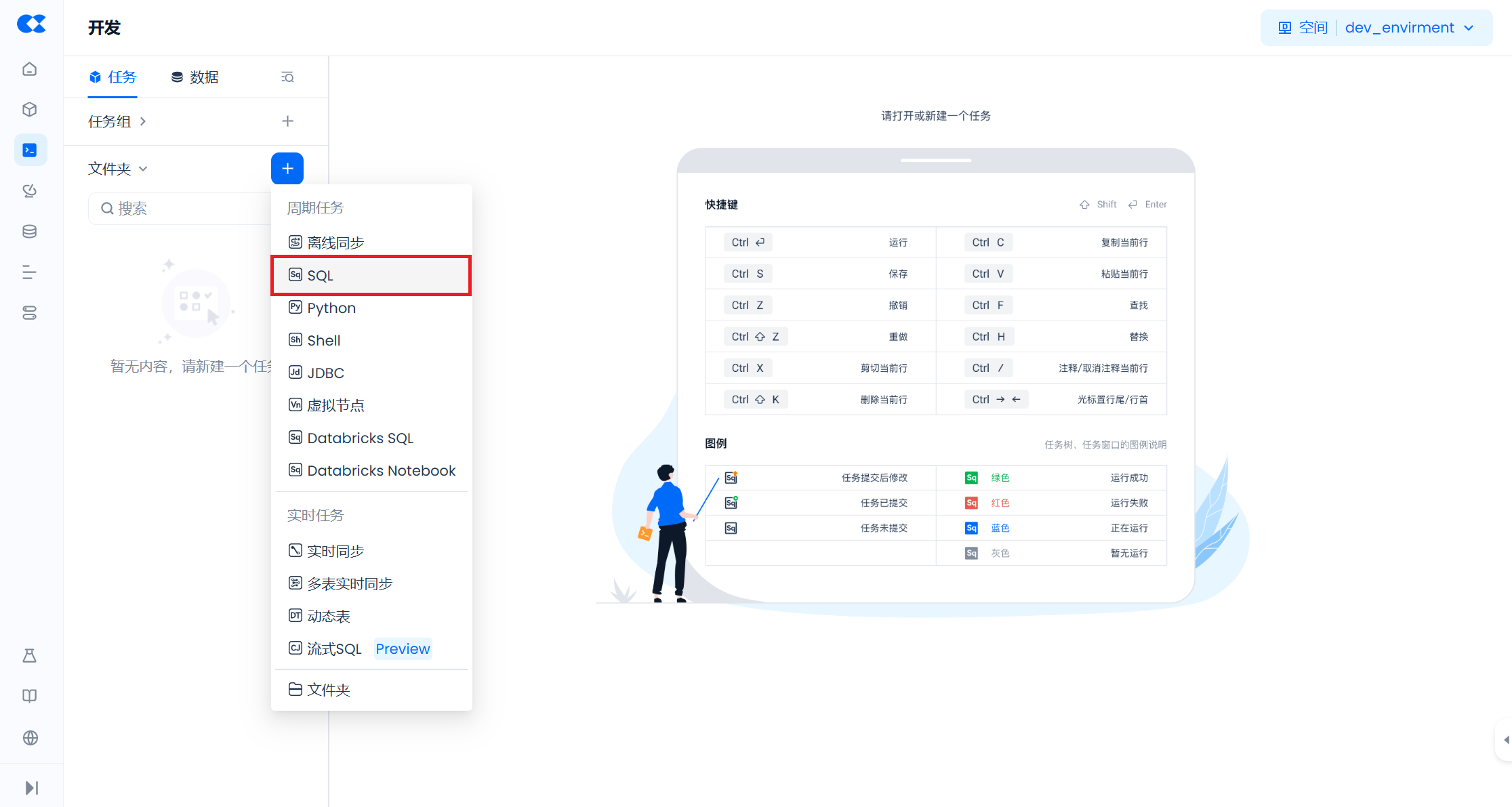 After the developer user logs in, go to the "Development" page in the left menu. Since the current developer user has only joined the dev_environment workspace, there is no need to switch workspaces. If multiple workspaces are joined, you can switch to the required workspace for development in the upper right corner.