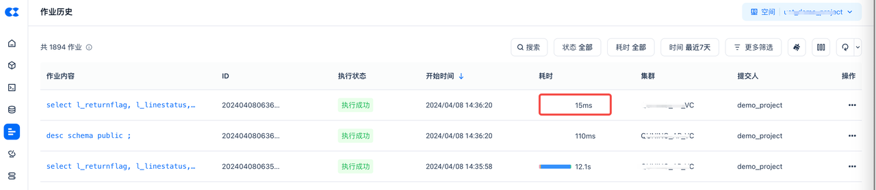 To demonstrate query result caching, first enable the result cache and execute an SQL query in Singdata Lakehouse. Then rerun the same query to verify if the new query reused the result cache for acceleration.