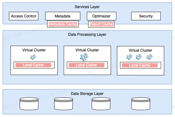 - Metadata Cache and Query Result Cache services belong to the service layer and can be shared within the workspace.