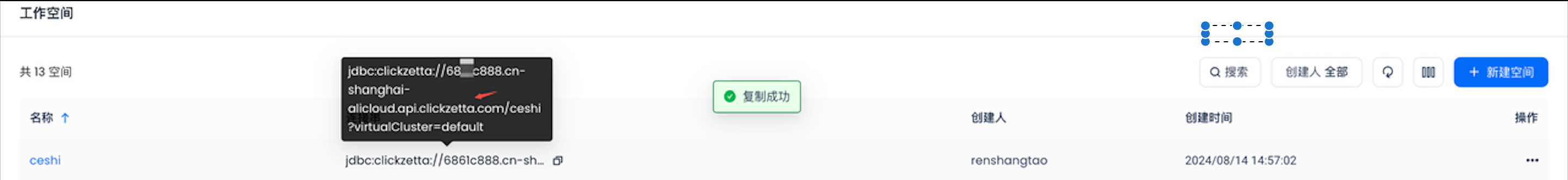 | endpoint | Y | The endpoint address for connecting to Lakehouse, e.g., 6861c888.cn-shanghai-alicloud.api.clickzetta.com. You can find the JDBC connection string in Lakehouse Studio under Management -> Workspace. The domain name in the JDBC connection string is the endpoint |