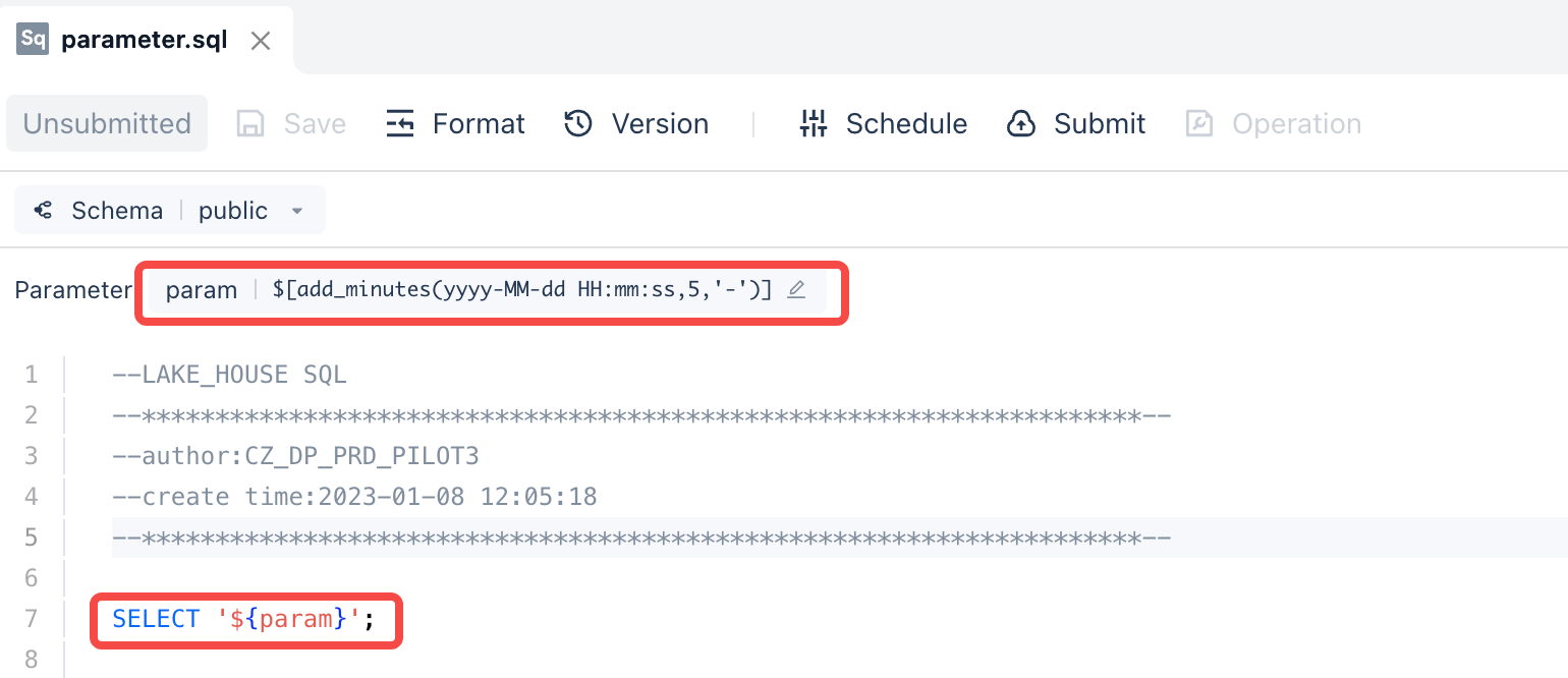 Built-in system parameters can be directly used when assigning values to user-defined parameters. As shown below, in the code, you can directly write ${param} to reference the parameter. When assigning a value to param, you can use sys_plan_day as the right value.