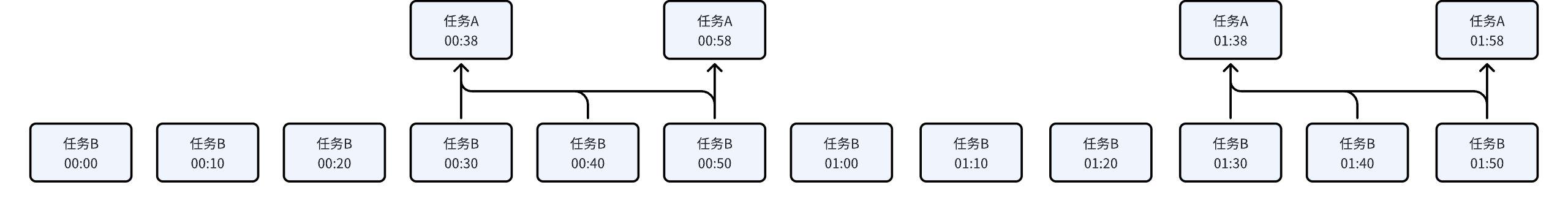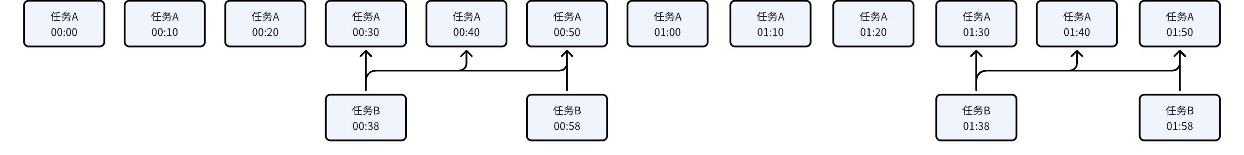 | Minute Task B Depends on Minute Task A | Task A: 00:38-01:59 interval, generates an instance every 20 minutes. A total of 4 instances are generated, with the first instance at 00:38. Task B: 00:00-01:59 interval, generates an instance every 10 minutes. A total of 12 instances are generated, with the first instance at 00:00. | ![]() |