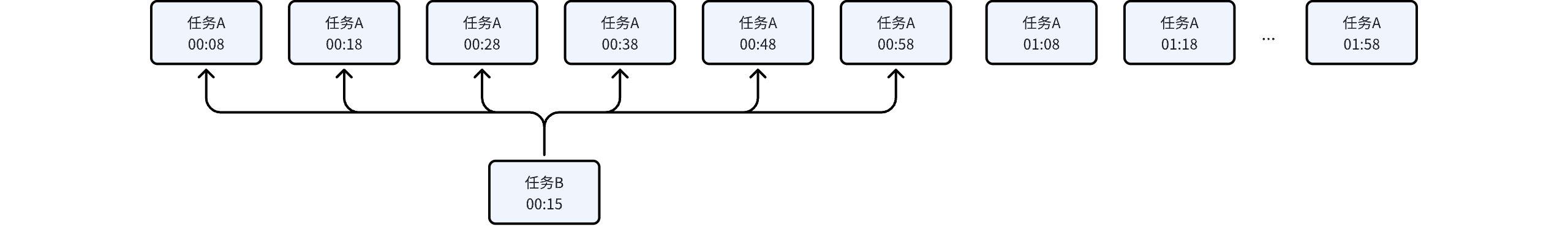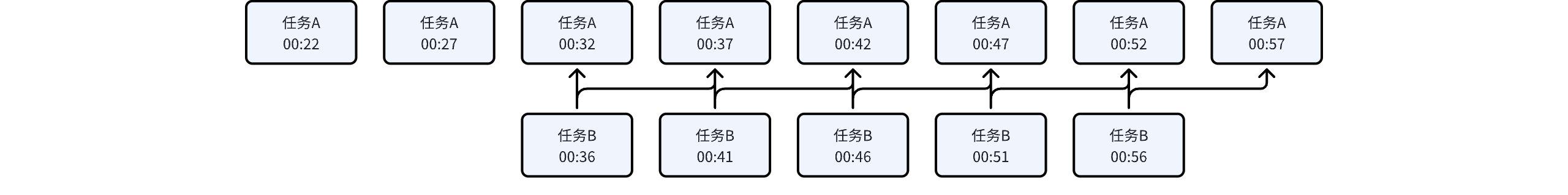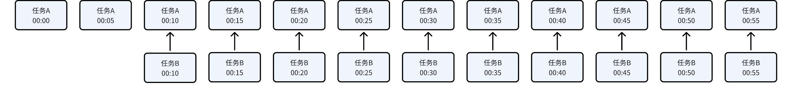 | Task A: 00:22-00:59 interval, generate an instance every 5 minutes. A total of 8 instances, the first instance at 00:12. Task B: 00:36-00:59 interval, generate an instance every 5 minutes. A total of 5 instances, the first instance at 00:15. | ![]() |