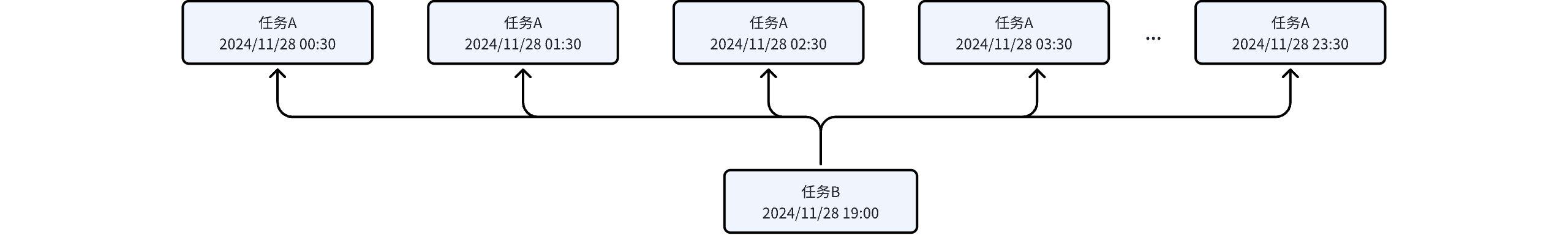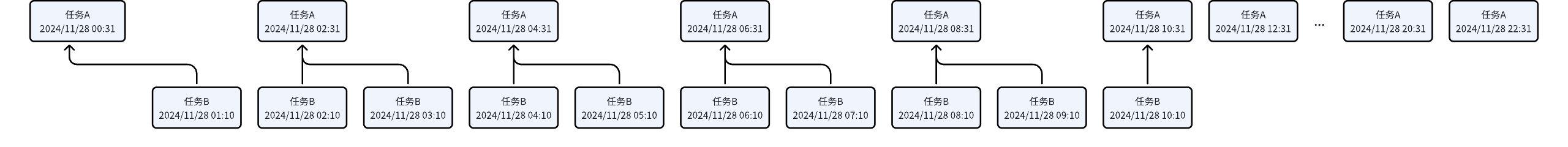 | Hourly Task B depends on Hourly Task A | Task A: Interval from 00:31 to 23:59, generate an instance every 2 hours. A total of 12 instances are generated, with the first instance at 00:31. Task B: Interval from 01:10 to 10:59, generate an instance every 1 hour. A total of 10 instances are generated, with the first instance at 01:10. | ![]() |