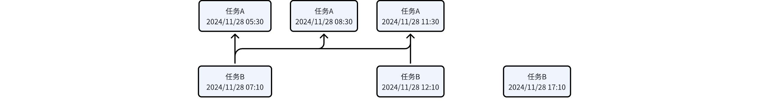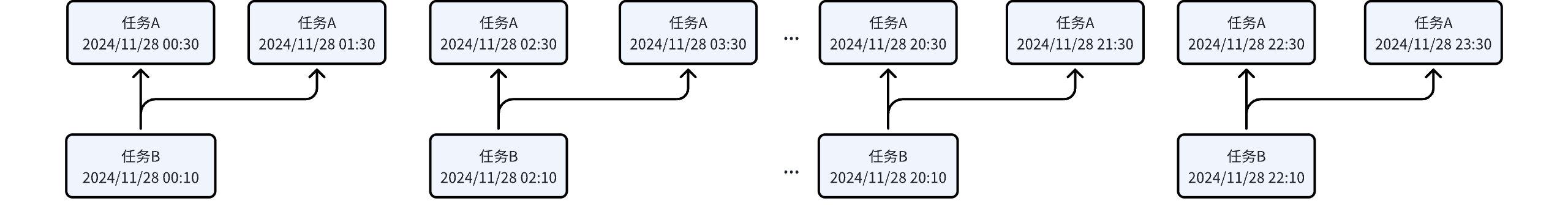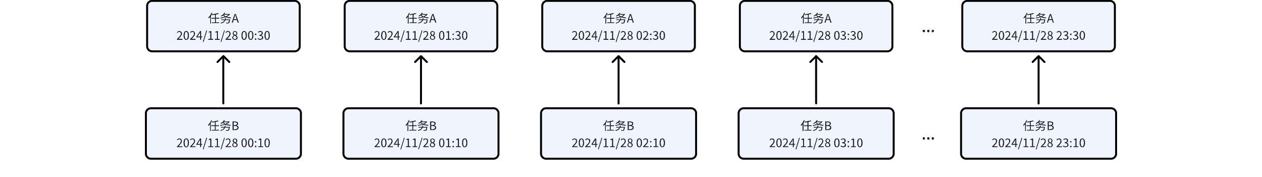 | Hourly Task B depends on Hourly Task A | Task A: 00:31-23:59 interval, generates an instance every 1 hour. A total of 24 instances, the first instance is at 00:31. Task B: 00:10-23:59 interval, generates an instance every 1 hour. A total of 24 instances, the first instance is at 00:10. | ![]() |