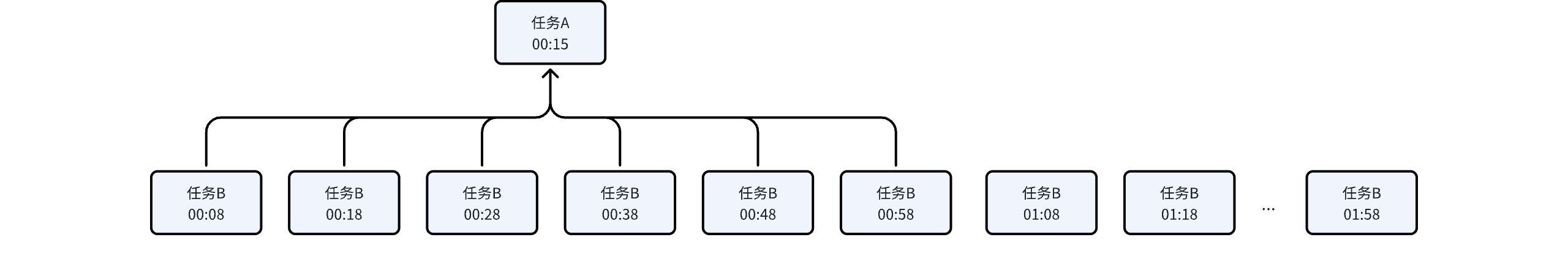 | Hourly Task B depends on Minute Task A | Task A: Interval from 00:08 to 01:59, generate an instance every 10 minutes. A total of 12 instances are generated, with the first instance at 00:08. Task B: Interval from 00:15 to 00:59, generate an instance every 1 hour. A total of 1 instance is generated, with the first instance at 00:15. | ![]() |