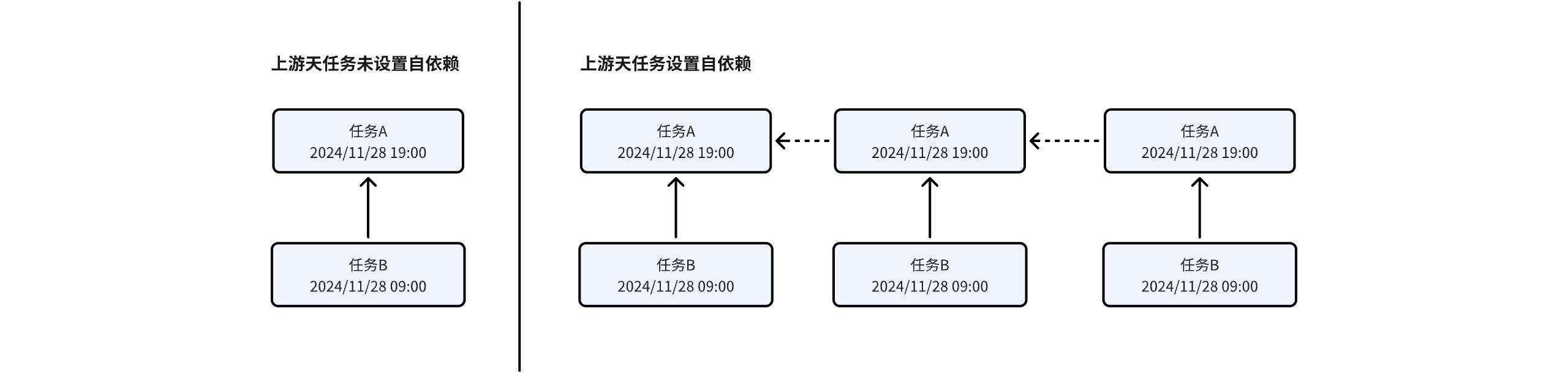 | Daily Task B depends on Daily Task A | Task A: Generates 1 instance every day at 19:00 Task B: Generates 1 instance every day at 09:00 Upstream daily task does not set self-dependency By default, the periodic instance of the downstream daily task mounts dependency to the periodic instance of the upstream daily task in the same cycle. Upstream daily task sets self-dependency Upstream daily task sets self-dependency, and there is a cross-cycle dependency when the downstream daily task depends on the upstream daily task. | ![]() Note: Any type of self-dependency will create a dependency relationship with the previous cycle. If the previous cycle is not completed, it will prevent the next cycle's task from being scheduled. The diagram only demonstrates the daily cycle, subsequent types will not be repeatedly explained. |