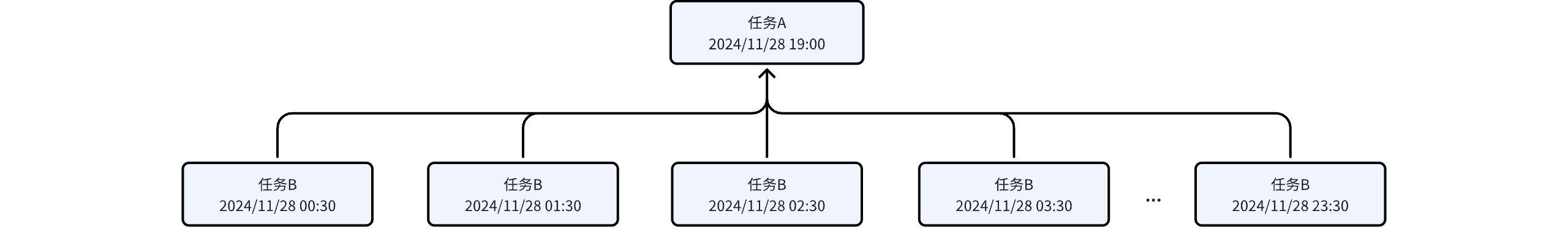 | Hourly Task B depends on Daily Task A | Task A: Generate 1 instance every day at 19:00. Task B: Interval from 00:31 to 23:59, generate an instance every 1 hour. A total of 24 instances are generated, with the first instance at 00:31. | ![]() |
