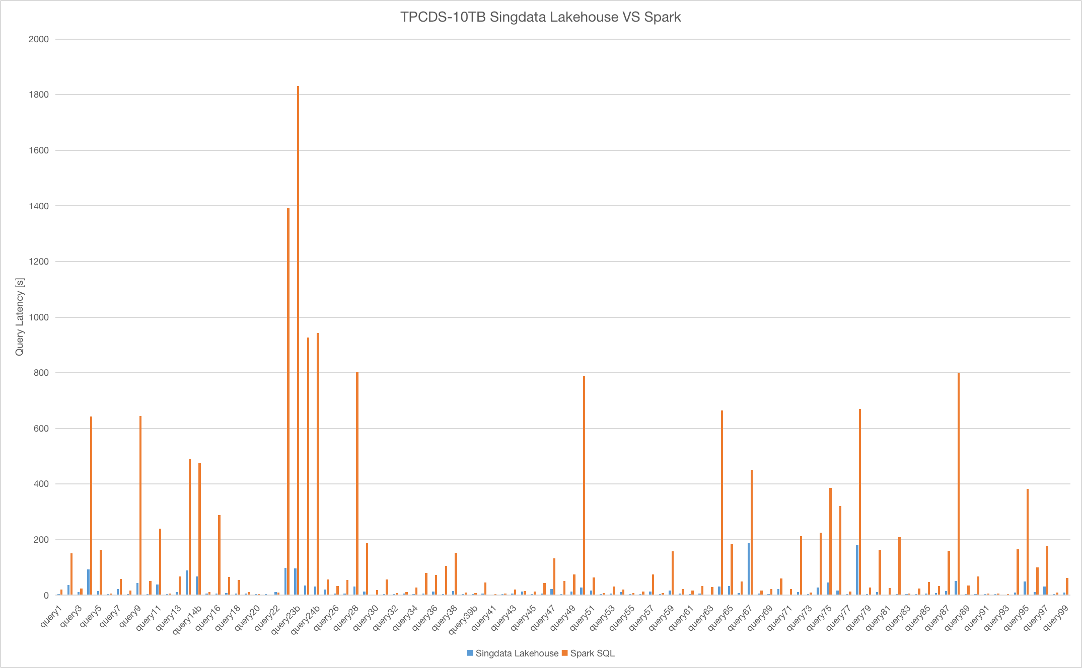 - In the comparative test on the TPC-DS 10TB scale data set, Singdata Lakehouse showed significant performance advantages over Spark, with performance equivalent to 9.51 times that of Spark.